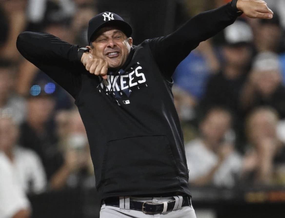 What’s my move of choice? A little sprinkler. A little shopping cart. I have a mean Michael Jackson spin and leg kick. With the HEE HEE to really sell it! When I pull that out of the bag you know the gas tank is almost on E. Sometimes I’ll mix in the lawn mower. Gotta imagine it looks like Aaron Boone from last night: