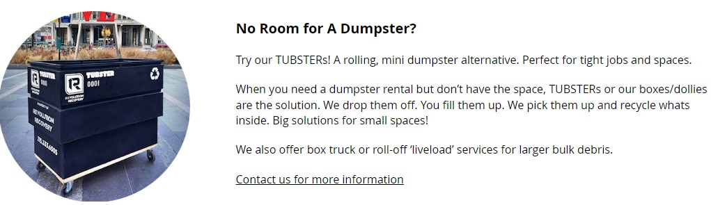 Is this like the Bagster? A dumpster in a bag! What came first – the Tubster or the Bagster? Inquiring minds would like to know! Good thing we have Google, which reveals that the Tubster is offered by a local company called Revolution Recovery: