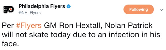 Nolan Patrick, who underwent yet another abdominal hernia surgery just before the draft that we just found out about two weeks ago, was supposed to SKATE for the assembled media in Voorhees. Today. He won’t be doing that now.