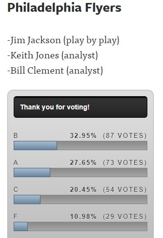 For what it’s worth, the Flyers’ crew finished 16th when Awful Announcing did their last round of voting four years ago. The average grade was a 2.27, which amounted to a B.