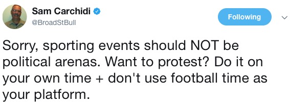 His Tweet lacked any semblance of nuance. It doesn’t even attempt to comprehend the meaning behind the protests, not the least of which this weekend had more to do with telling Donald Trump to fuck off than it did with any one particular issue. And the tone-deafness of using a sport like hockey, almost exclusively white, to make his point is laughable and yet par for the course for Carchidi. His Tweet dismisses hundreds of years of pent up frustrations and pleas for help with a casual “not during my sports” take, ironically using his platform that exists solely because of sports and his employer’s head-scratching decision to allow him to continue to cover them.