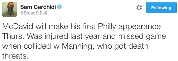 The Flyers defenseman said he received the threats after he collided with Edmonton’s Connor McDavid on Nov. 3, and the Oilers’ hotshot rookie suffered a broken collarbone on the play.