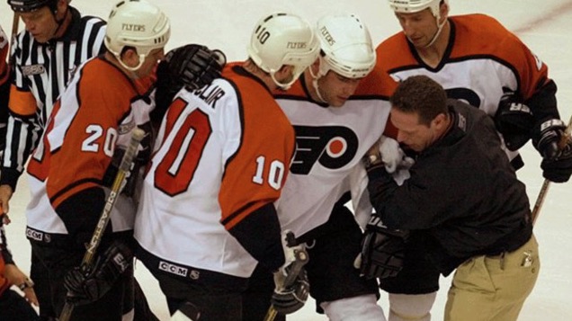 Leave it to NBC 10 to choose a photo of Eric Lindros being lugged off the ice after Scott Stevens nearly removed his head in the 2000 Eastern Conference Finals, or, as I refer to them, the @%&*#@!&$#@$@$%$#$@#%#$!@#^@$@#@als.