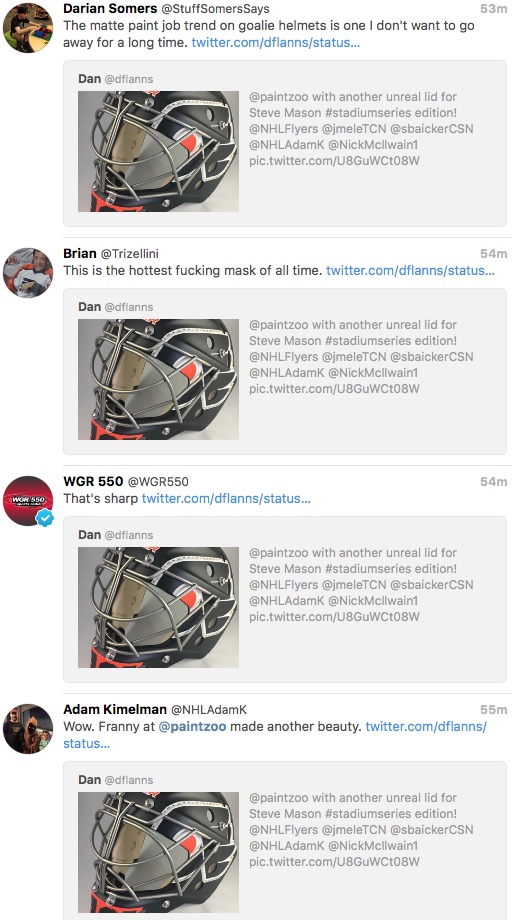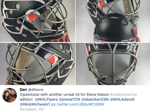 We’re a very excitable fanbase. Every Sixers win gives us reason to raise our fucking felines, and put the Phillies in throwback uniforms once a year and we lose our shit. It’s just how we are, even about the smallest things. To wit: Steve Mason’s stadium series mask, shown in here a now deleted Tweet from (@dflanns):