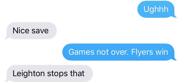 Is what I’m a sayer of. This text conversation with my buddy came at 9:22 p.m., just after Steve Mason saw a Big Bear and let one in the side: