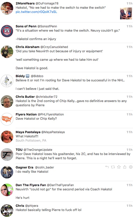 He has already perfected the art of saying nothing. In an interview with Pierre McGuire, who today may be on the search for the perfect Zamboni hose, Hakstol “explained” the decision to put Mason in net in the second period: