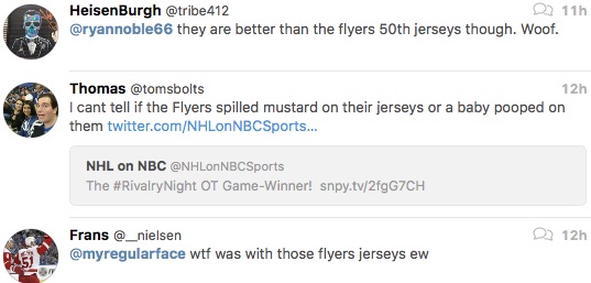 Hey the Flyers won last night in overtime of a game that six people watched. I saw a highlight of the winning goal and reflexively vommed myself upon the sight of the green numbers on the jerseys.