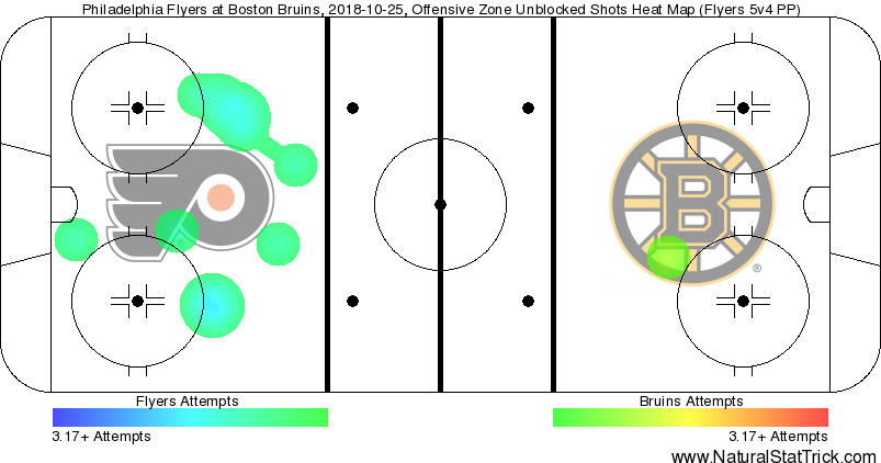 This shows the shot concentration on the Islanders’ three power plays on the day. The corresponding image isn’t even worth showing. The image was blank. That’s right, folks, not a single unblocked shot attempt on any of the Flyers’ three power plays. This led to plenty of fans and media questioning the team’s tactics, especially on the power play. Fast forward three days and things have drastically changed.