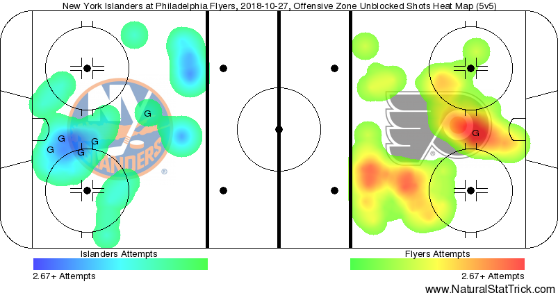 The Flyers faced an all-out assault against a dreadful Islanders’ attack in the final home game before the current road trip. The Flyers did show a willingness to get involved in the slot, though by comparison, their shot density from the blue line was exponentially higher than that of New York. The team’s Corsi-For and Fenwick-For numbers were higher, but the actual number of quality shots on goal were lower than against the Bruins. The power play numbers were simply stunning: