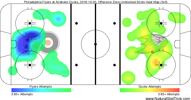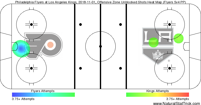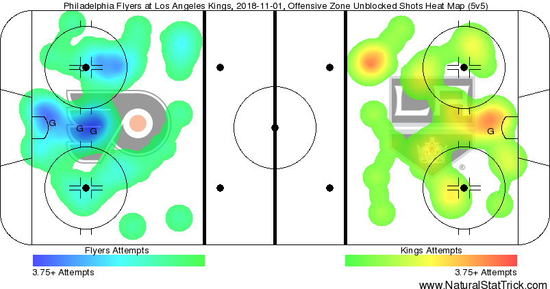 If the Flyers’ effort against the Ducks was encouraging, it was even moreso against the Kings. While not every shot generated was from near the crease, the only registered unblocked shots were.