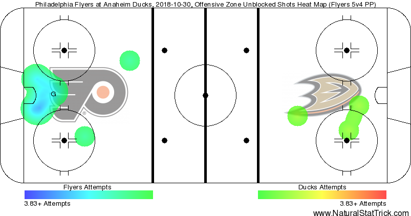 Holy schnikes! Will you take a look at that? Not only did the Flyers’ attack at even strength feature a high density of shots from the slot, there was a greater effort to crowd the net and create opportunities in the crease. While shots from the point were still a point of emphasis, notice the marked increase in those shots coming closer to the circles, as opposed to the zone parallel to the blue line. The traditional stats show the Flyers out-shot Anaheim by 11 shots (36-25), while the advanced stats show an even percentage of Corsi-For and a slight Fenwick edge. In this case, the traditional metrics tell the true story.