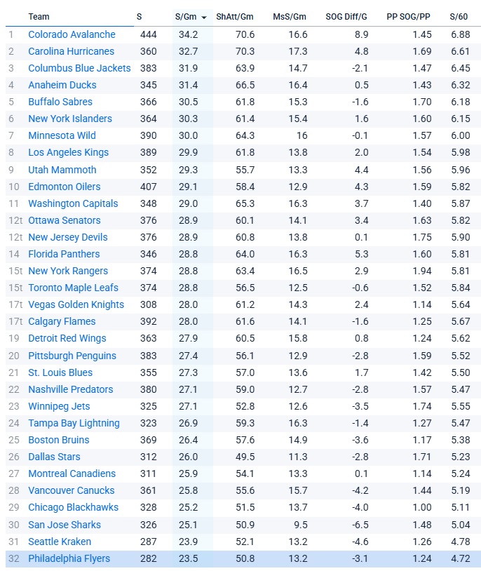 Ranked 32nd out of 32 teams with 23.5 shots on goal per game, and the related numbers don’t help much.