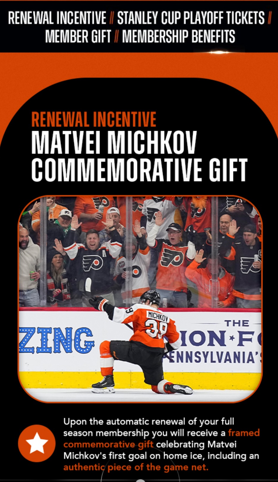 EDIT – Got some more info from season ticket holders. This is from someone approaching 15 years in the lower bowl. They’re offering a Matvei Michkov perk and assorted other things: