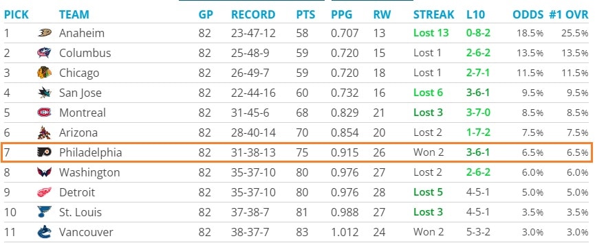 For what it’s worth, the last time Philly had a 6.5% chance at the top spot, and were seeded 7th in the odds, they ended up staying pat at #7 overall and took Ivan Provorov. That was back in 2015. Same thing with Sam Morin in 2011. They historically have not experienced a lot of movement against the odds, up or down, outside of that 2017 outlier.