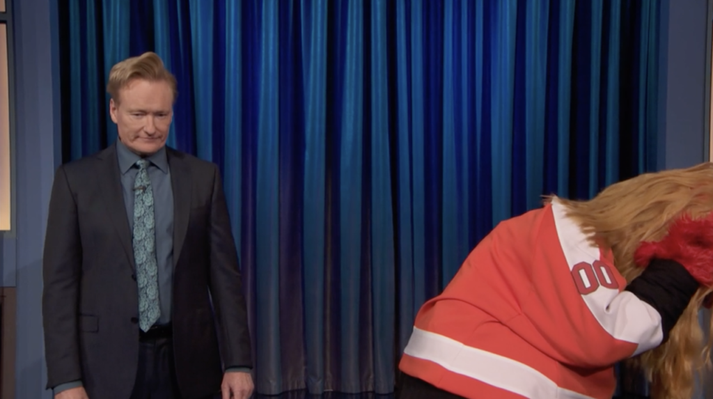 Gritty dropped by Conan last night and we got to meet the man behind the mask.