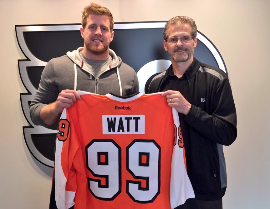J.J. Watt stopped by Flyers practice today. Why? Fuck knows. But he got a jersey and, reportedly, Ron Hextall had to physically restrain Paul Holmgren from pulling executive privilege and offering Watt a five-year, $42.5 million deal because he is a “big, stay-at-home defenseman.”