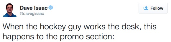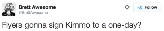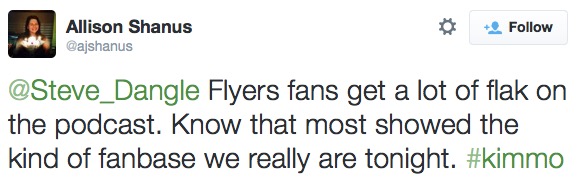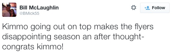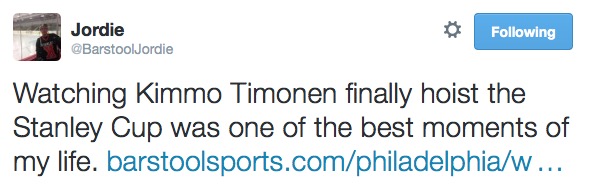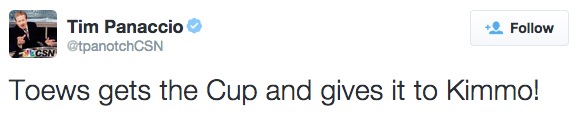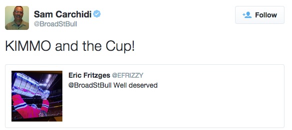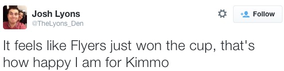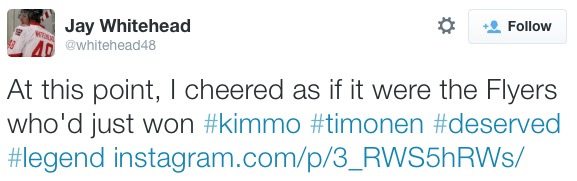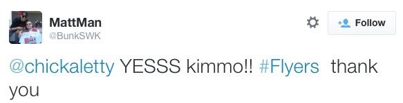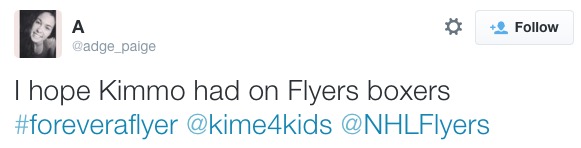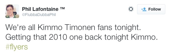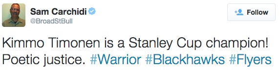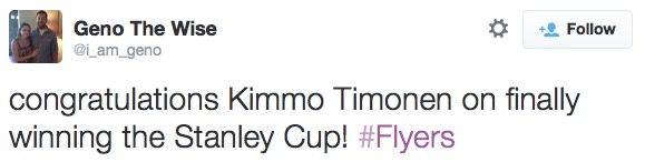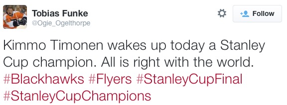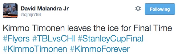 NO NOT HASHTAG FLYERS. HASHTAG BLACKHAWKS!! THE BLACKHAWKS WON THE STANLEY CUP!!!! And are you kidding me, Dave, who covers the team in some capacity, with that #KimmoForever hashtag? Like, we being serious right now, bro?
