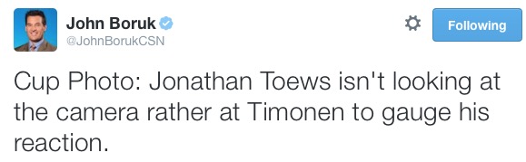 John Boruk is an idiot. They probably took 200 pictures with the Cup and he finds the one where Toews is looking to his right – perhaps at Kimmo, perhaps at one of the 50k other things going on in the building (maybe someone farted!) – and interprets it thusly. Great observation, John. You’re a valuable and respected voice in our city.