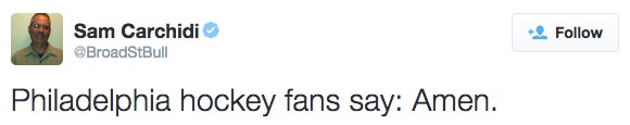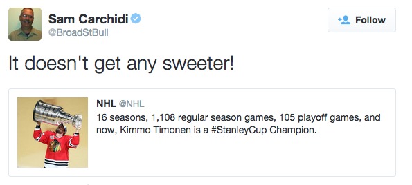 But all the fan Tweets and media favoritism in the world doesn’t compare to Philly’s former-Flyer and Bobby Ryan beat writer, Sam Carchidi, who was downright pornographic in his breathless, slurping coverage of Timonen. Look. At. This: