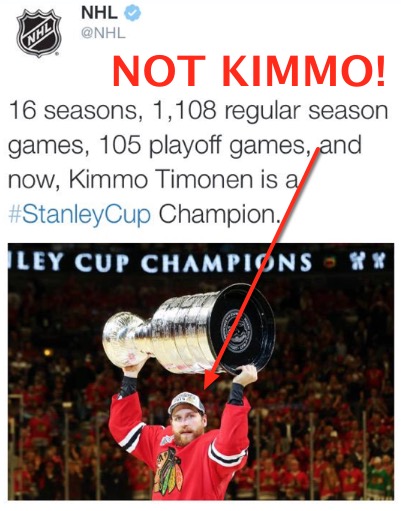Really? I hate to break it to everybody, but Kimmo Timonen is not Ray Bourque. Not even close, as evidenced by the fact that the guy or girl running the league’s Twitter account last night literally couldn’t even pick him out of a lineup of similarly-bearded hockey players: