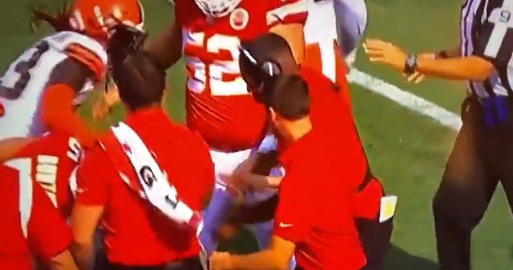 Former Eagles wide receiver coach, now Chiefs assistant coach, Greg Lewis got into it with Browns safety Ronnie Harrison on the sideline this past Sunday.