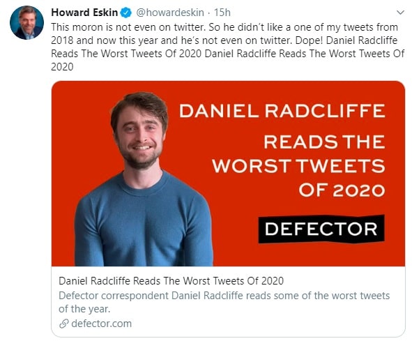 In this tweet, he calls Radcliffe a moron, gets the date of his tweet wrong, and doesn’t understand that Harry Potter is simply reading a list of tweets that were presented to him by somebody else: