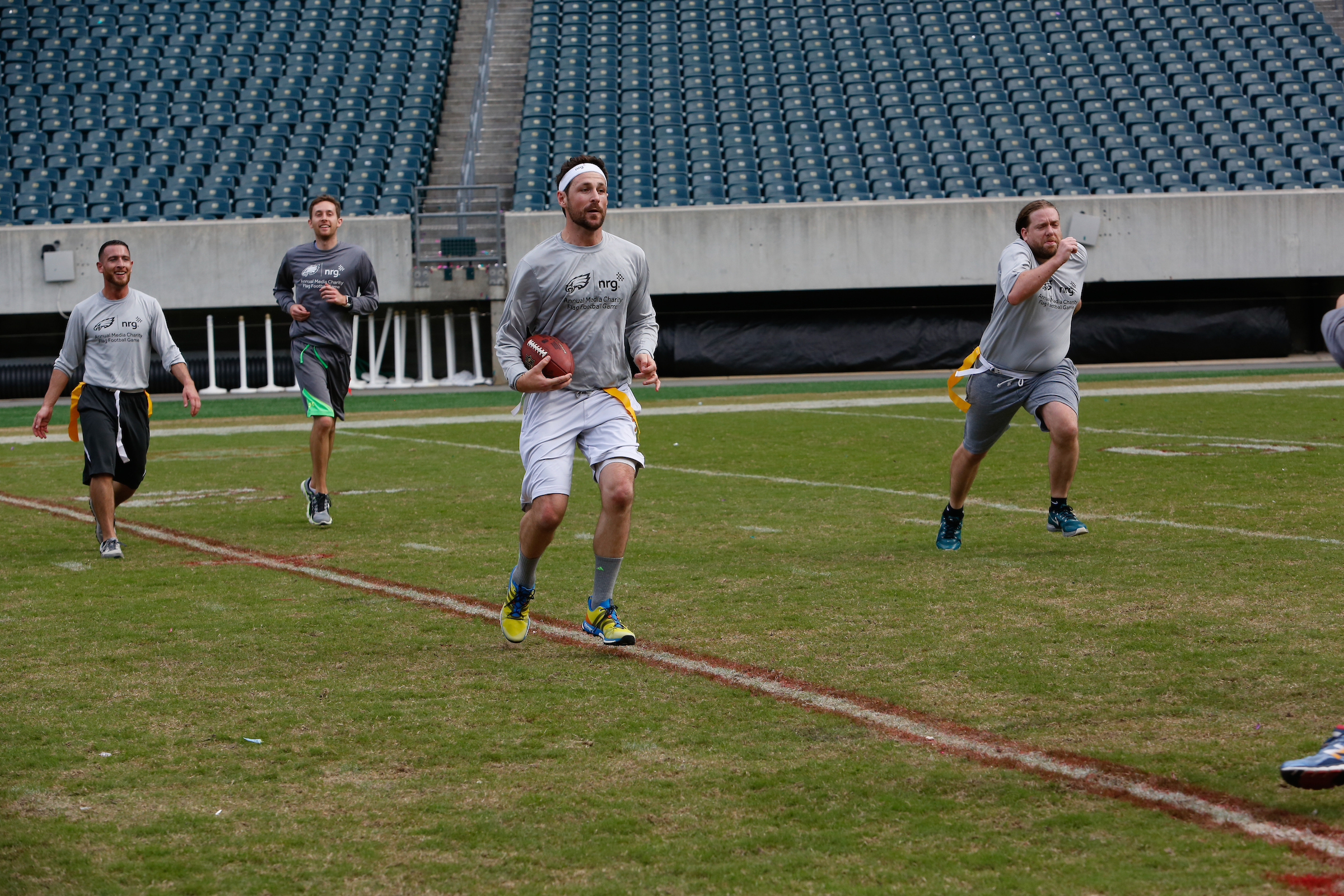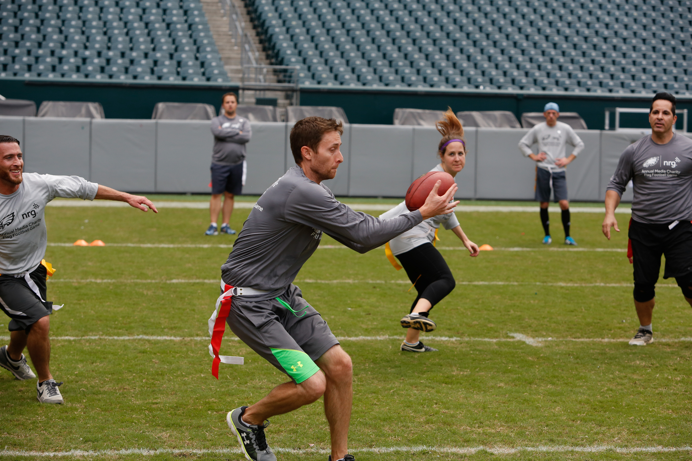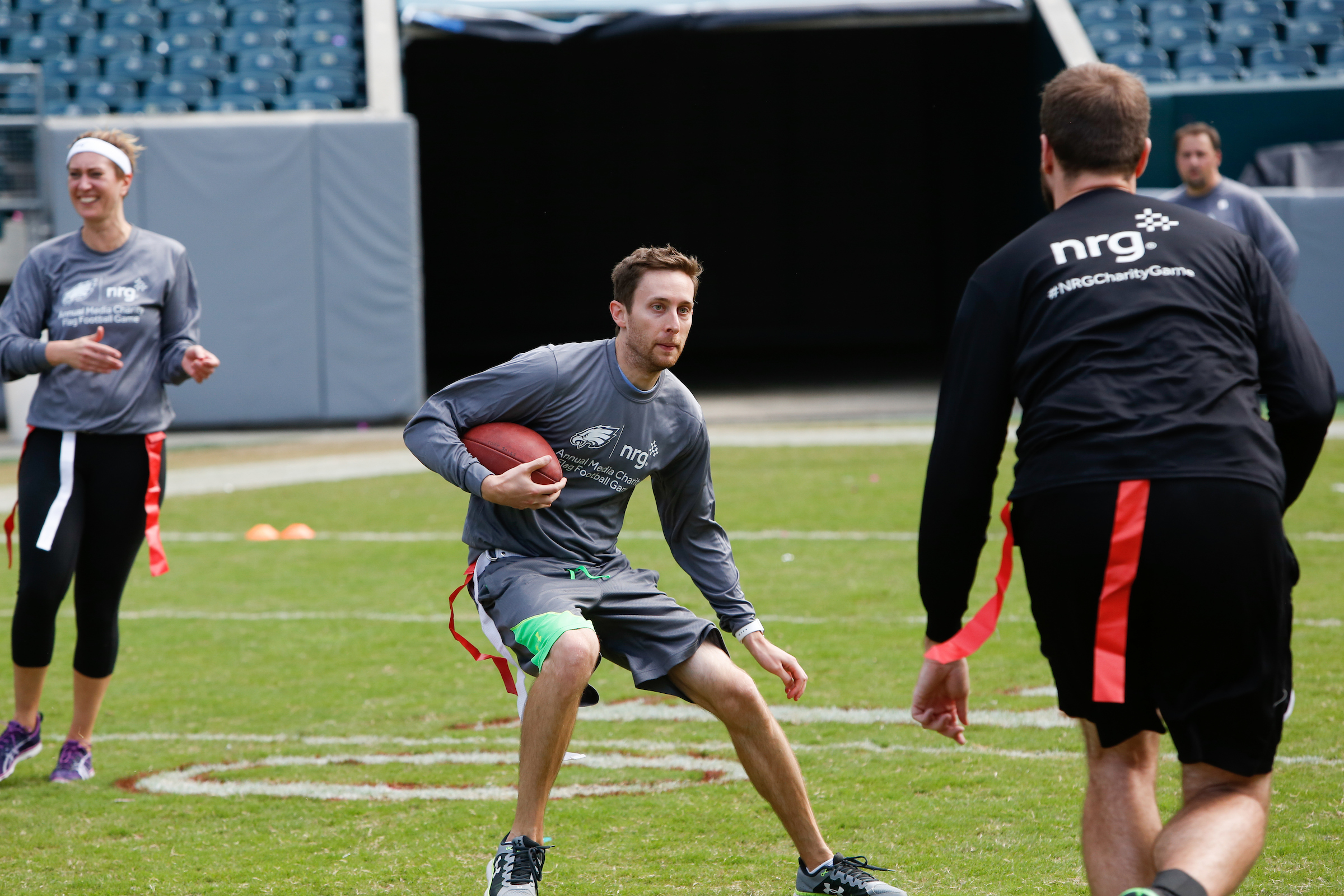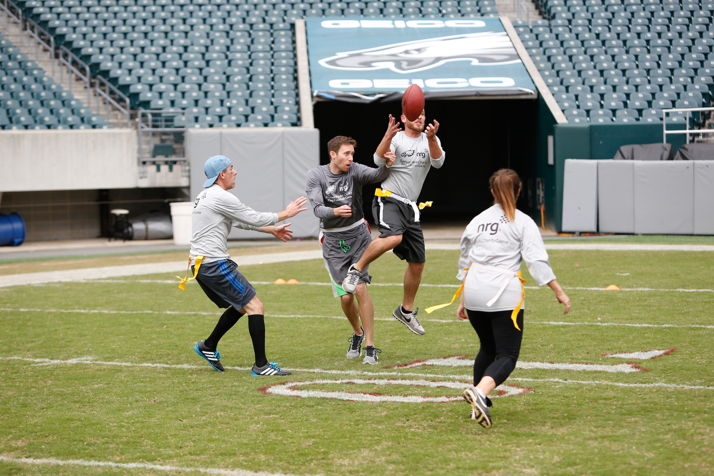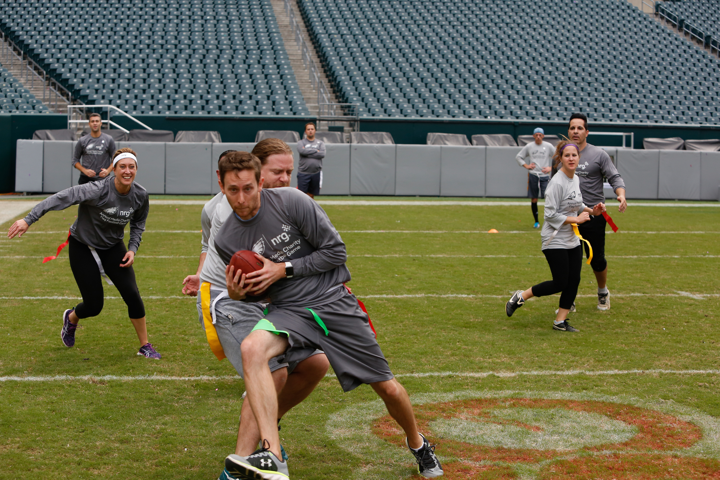 The good folks over at NRG Energy, longtime friends of the site, Eagles sponsors and partners of Connor Barwin, hosted a media flag football game at The Linc yesterday. I’ll spare you the 2,500-word recap, but I’d like to call your attention to this photo (as well as some others), featuring, from left-to-right, Phillies beat writer Ryan Lawrence, me, KYW anchor Dan Wing, and Julie Hancher of Green Philly. It would appear that three humans are battling with one ape to obtain an object of some intrinsic value before it unceremoniously crashes into the (shockingly hard and slightly unkempt) turf. What’s actually happening is stud defender breaks up pass intended for Wing (whom I believe won MVP last year) while he’s illegally blocked by Lawrence as Hancher attempts to save face for three pathetic males by actually catching the goddamn thing. Or, if you prefer, a pasty blogger commits pass interference in a flag football game: