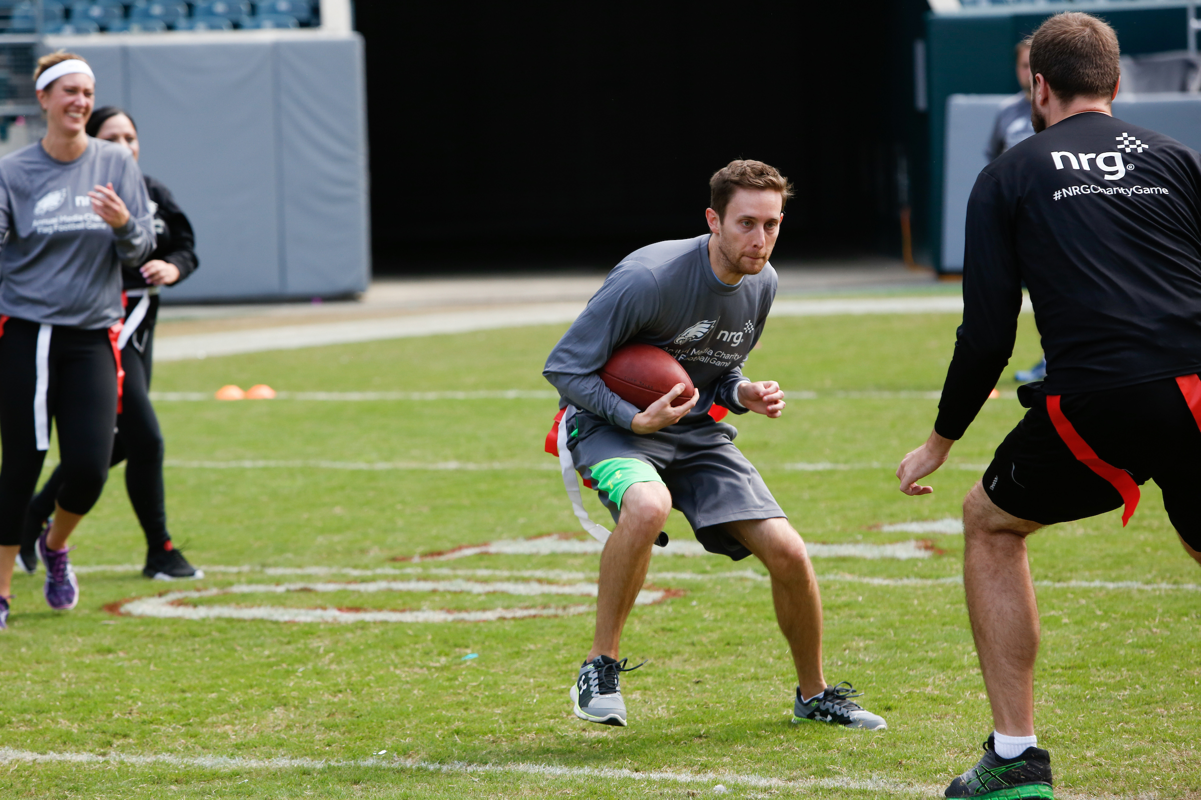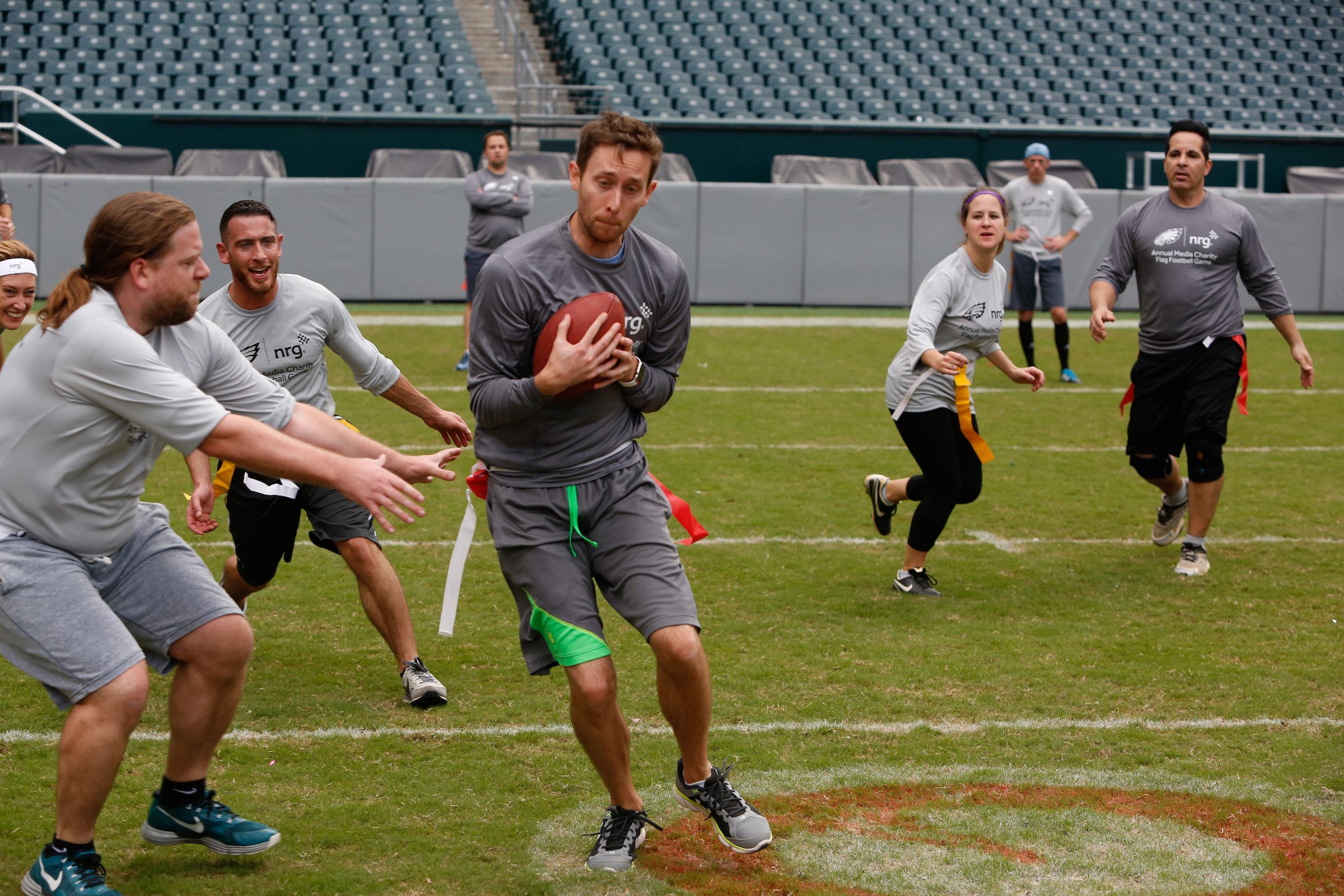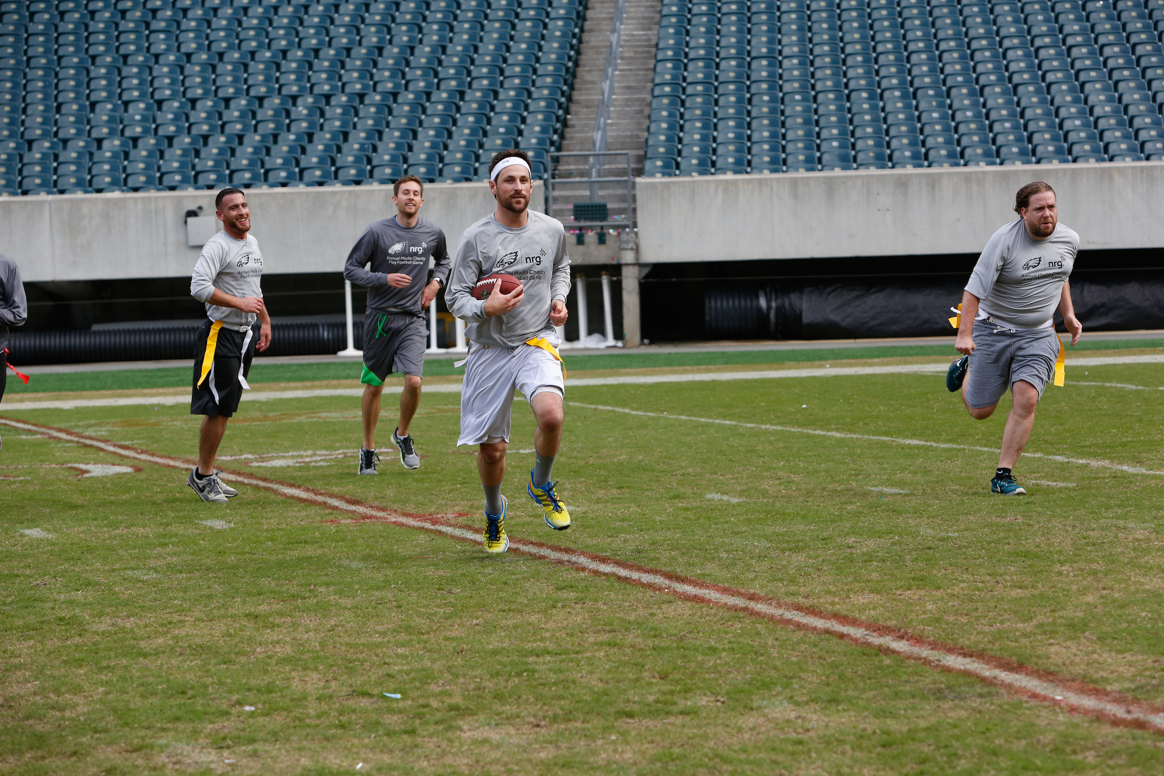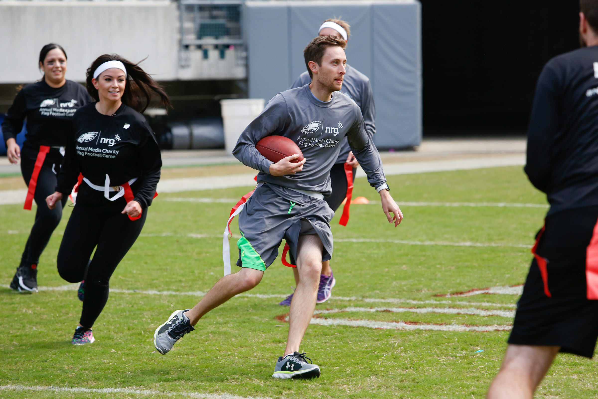 The good folks over at NRG Energy, longtime friends of the site, Eagles sponsors and partners of Connor Barwin, hosted a media flag football game at The Linc yesterday. I’ll spare you the 2,500-word recap, but I’d like to call your attention to this photo (as well as some others), featuring, from left-to-right, Phillies beat writer Ryan Lawrence, me, KYW anchor Dan Wing, and Julie Hancher of Green Philly. It would appear that three humans are battling with one ape to obtain an object of some intrinsic value before it unceremoniously crashes into the (shockingly hard and slightly unkempt) turf. What’s actually happening is stud defender breaks up pass intended for Wing (whom I believe won MVP last year) while he’s illegally blocked by Lawrence as Hancher attempts to save face for three pathetic males by actually catching the goddamn thing. Or, if you prefer, a pasty blogger commits pass interference in a flag football game: