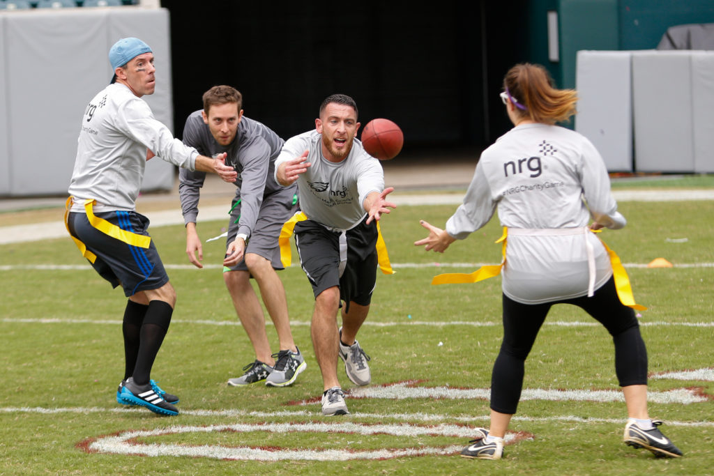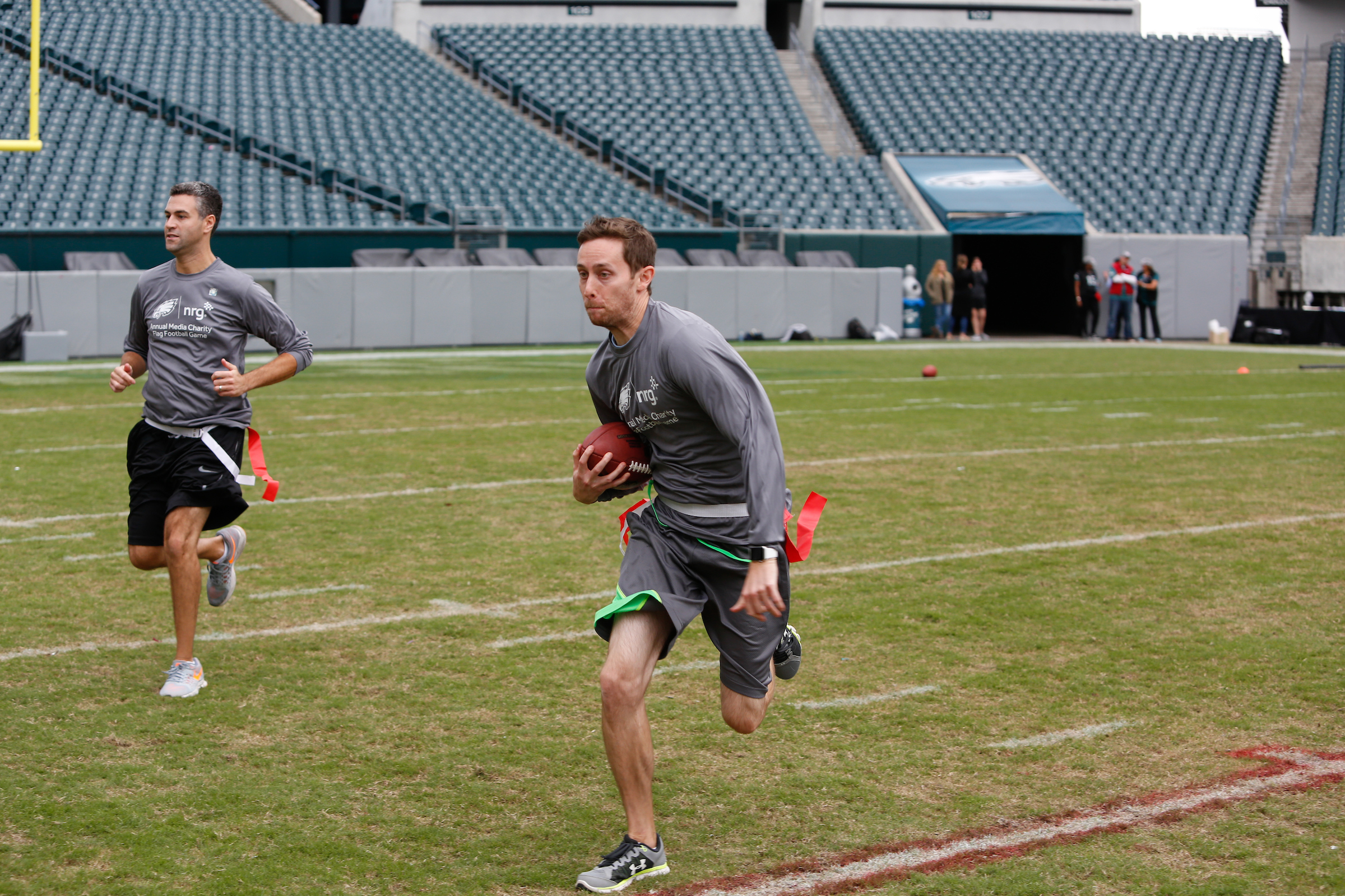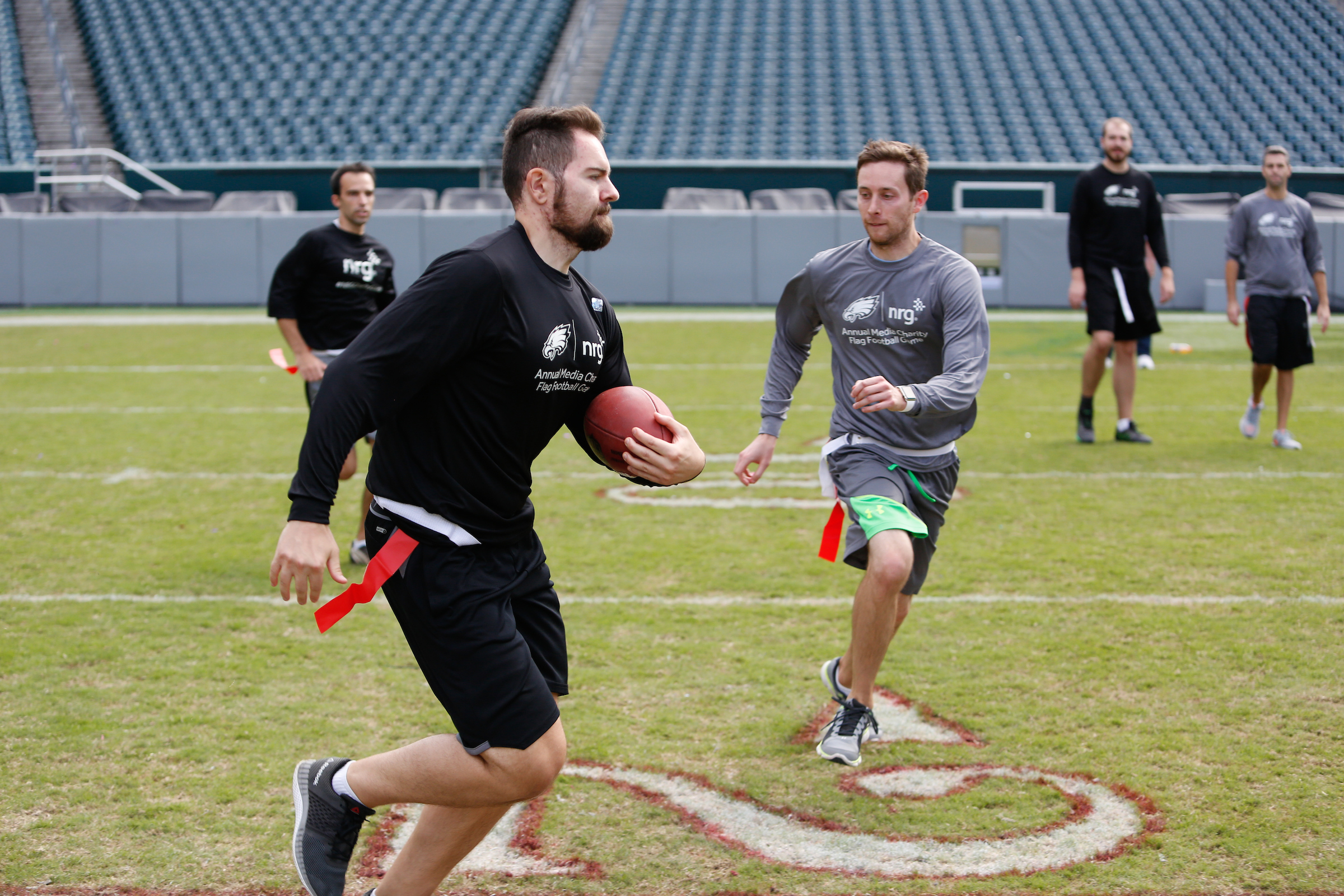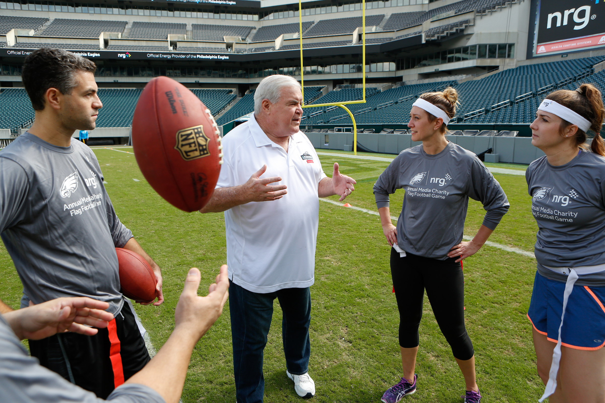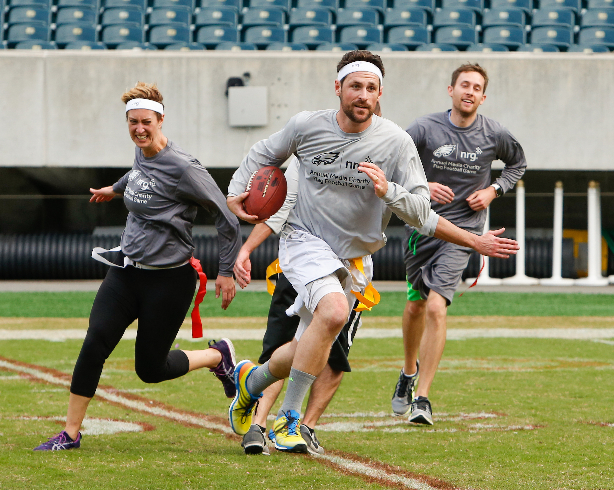 The good folks over at NRG Energy, longtime friends of the site, Eagles sponsors and partners of Connor Barwin, hosted a media flag football game at The Linc yesterday. I’ll spare you the 2,500-word recap, but I’d like to call your attention to this photo (as well as some others), featuring, from left-to-right, Phillies beat writer Ryan Lawrence, me, KYW anchor Dan Wing, and Julie Hancher of Green Philly. It would appear that three humans are battling with one ape to obtain an object of some intrinsic value before it unceremoniously crashes into the (shockingly hard and slightly unkempt) turf. What’s actually happening is stud defender breaks up pass intended for Wing (whom I believe won MVP last year) while he’s illegally blocked by Lawrence as Hancher attempts to save face for three pathetic males by actually catching the goddamn thing. Or, if you prefer, a pasty blogger commits pass interference in a flag football game:
