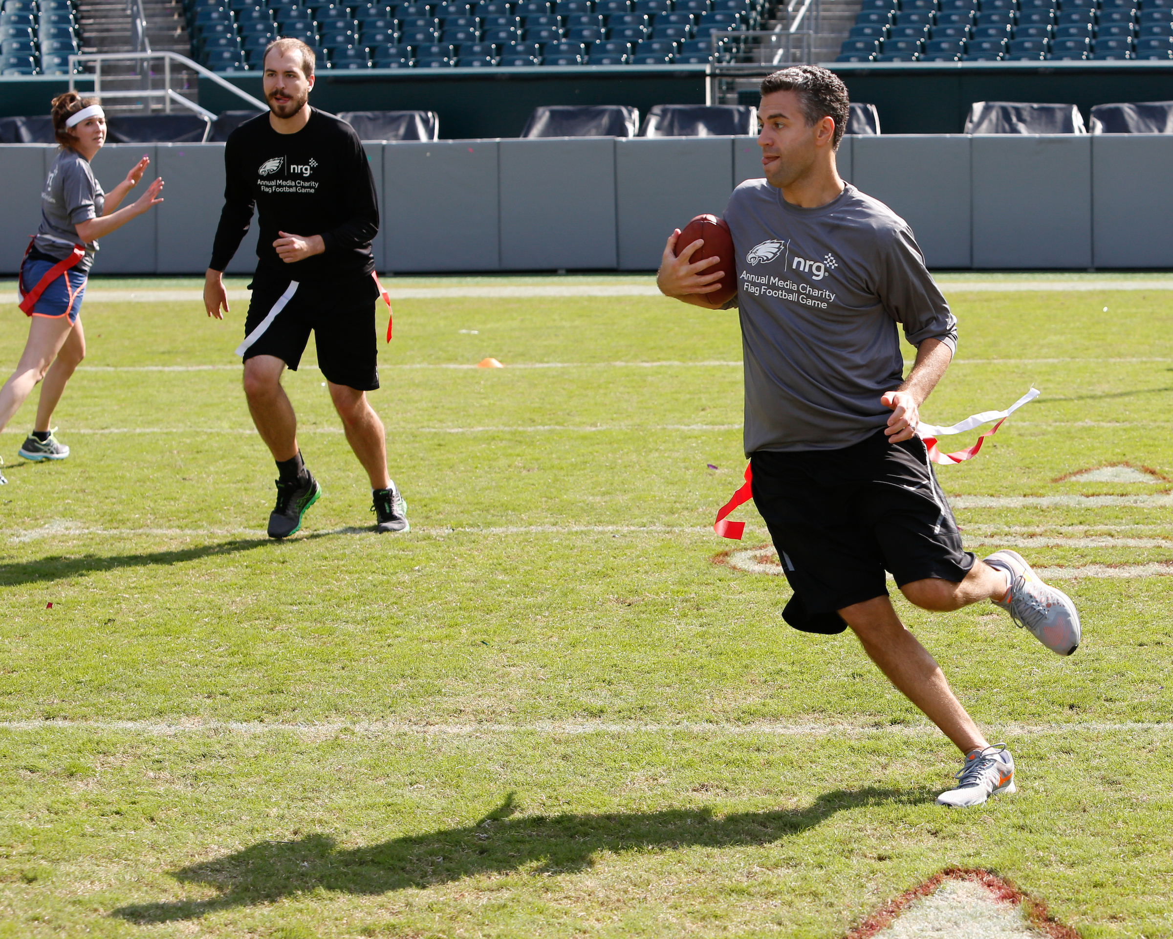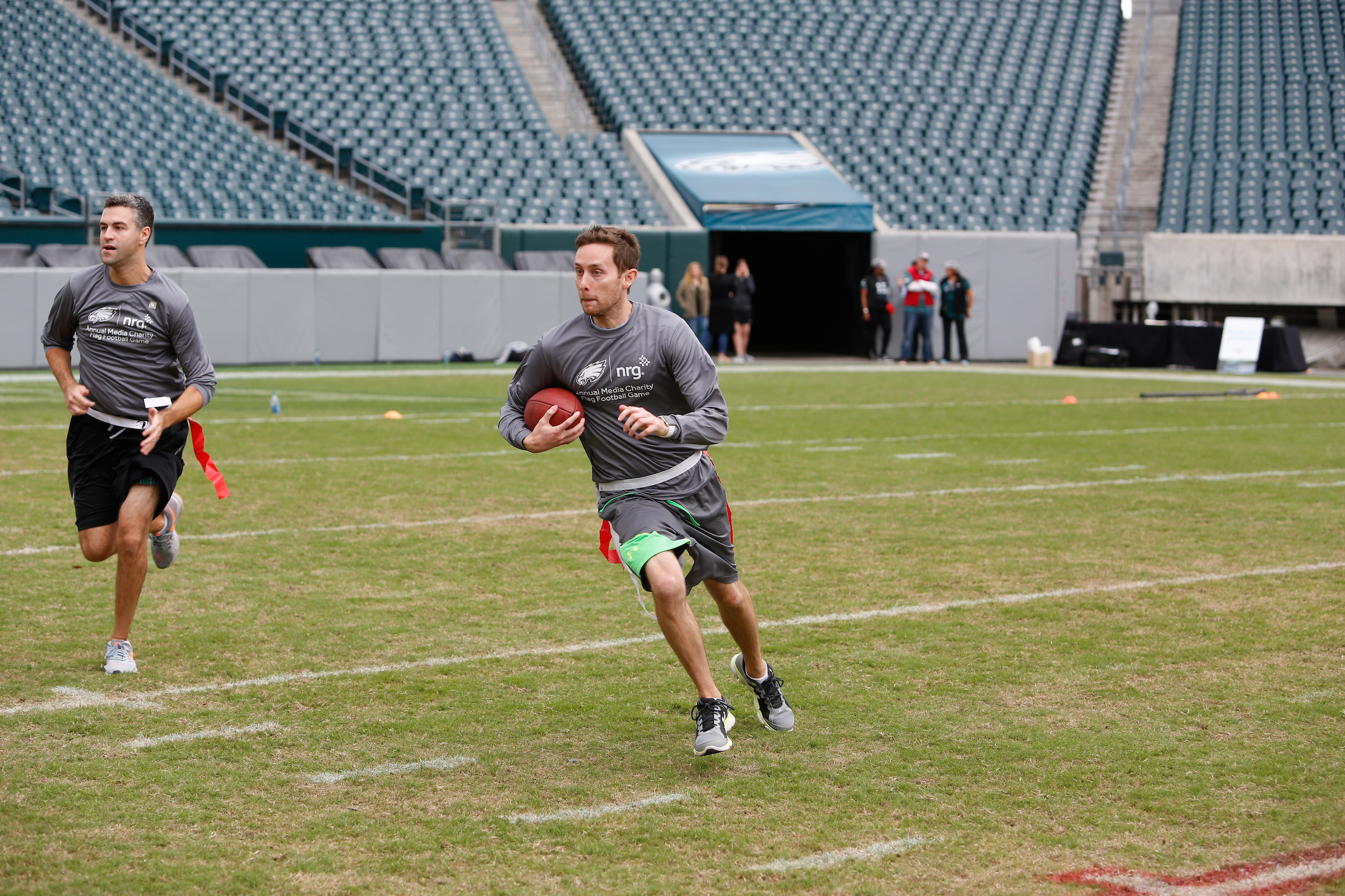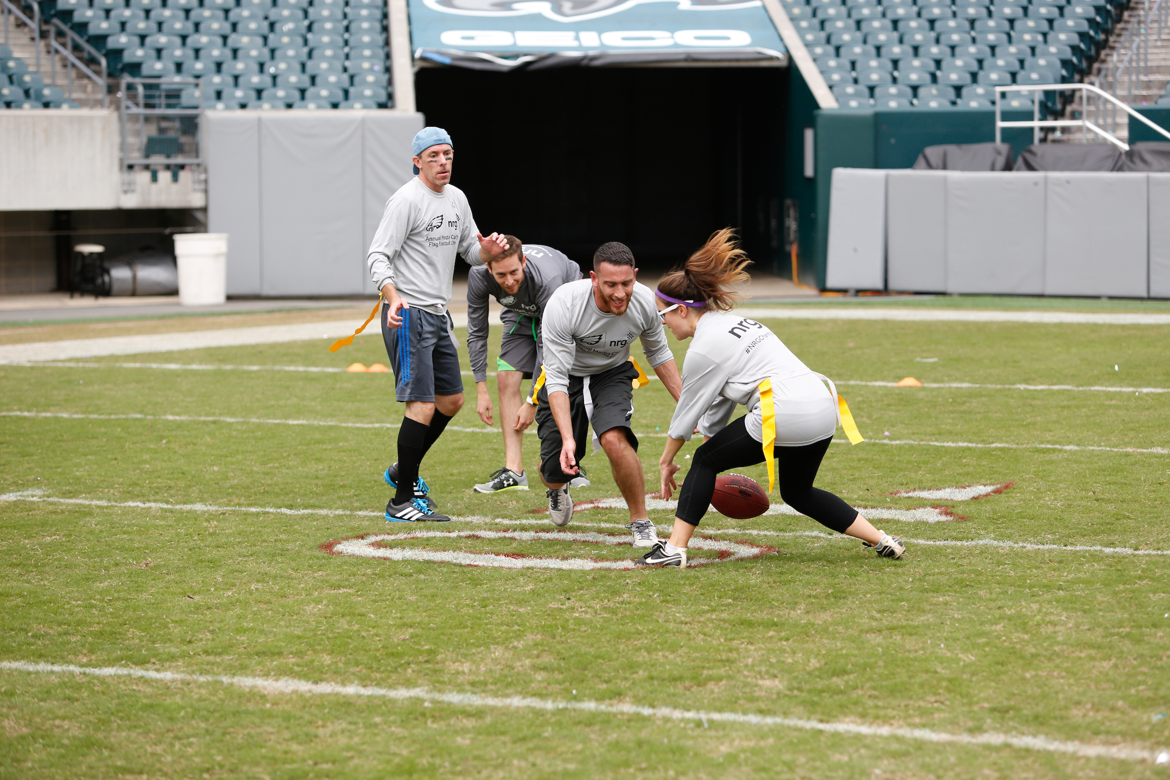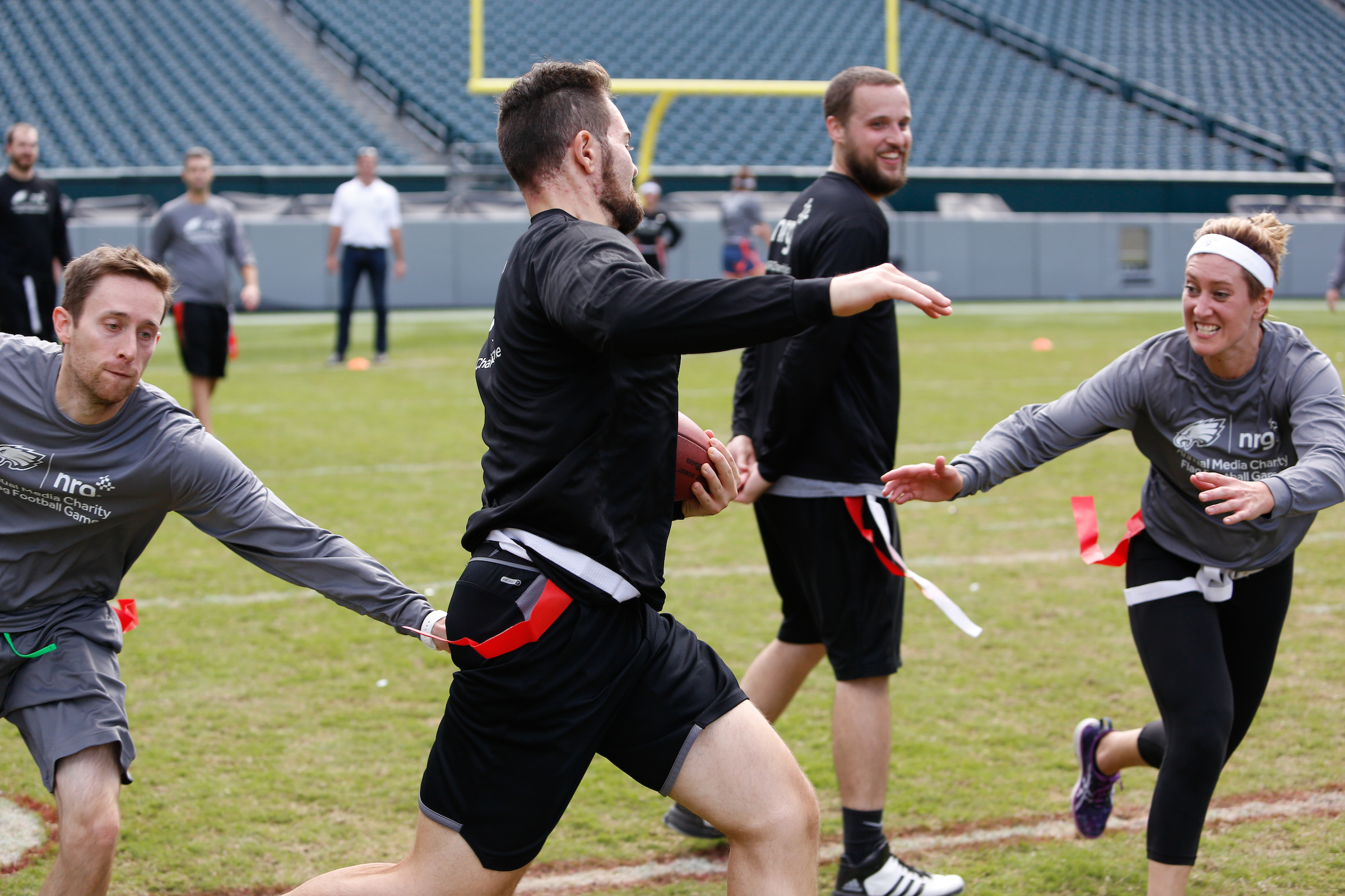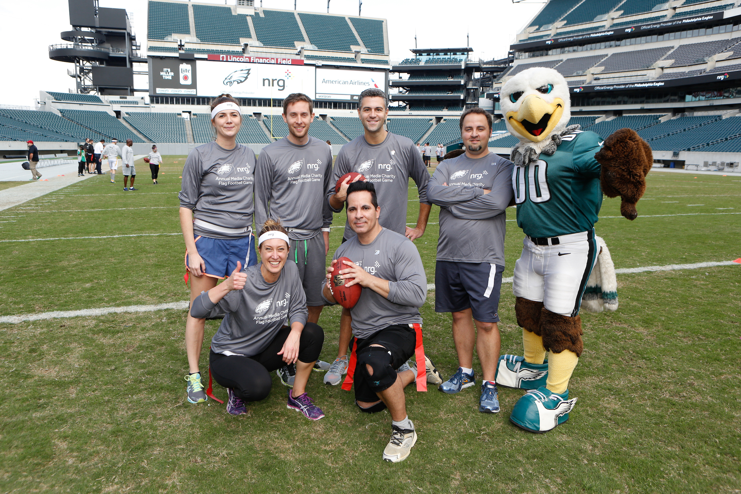 The good folks over at NRG Energy, longtime friends of the site, Eagles sponsors and partners of Connor Barwin, hosted a media flag football game at The Linc yesterday. I’ll spare you the 2,500-word recap, but I’d like to call your attention to this photo (as well as some others), featuring, from left-to-right, Phillies beat writer Ryan Lawrence, me, KYW anchor Dan Wing, and Julie Hancher of Green Philly. It would appear that three humans are battling with one ape to obtain an object of some intrinsic value before it unceremoniously crashes into the (shockingly hard and slightly unkempt) turf. What’s actually happening is stud defender breaks up pass intended for Wing (whom I believe won MVP last year) while he’s illegally blocked by Lawrence as Hancher attempts to save face for three pathetic males by actually catching the goddamn thing. Or, if you prefer, a pasty blogger commits pass interference in a flag football game: