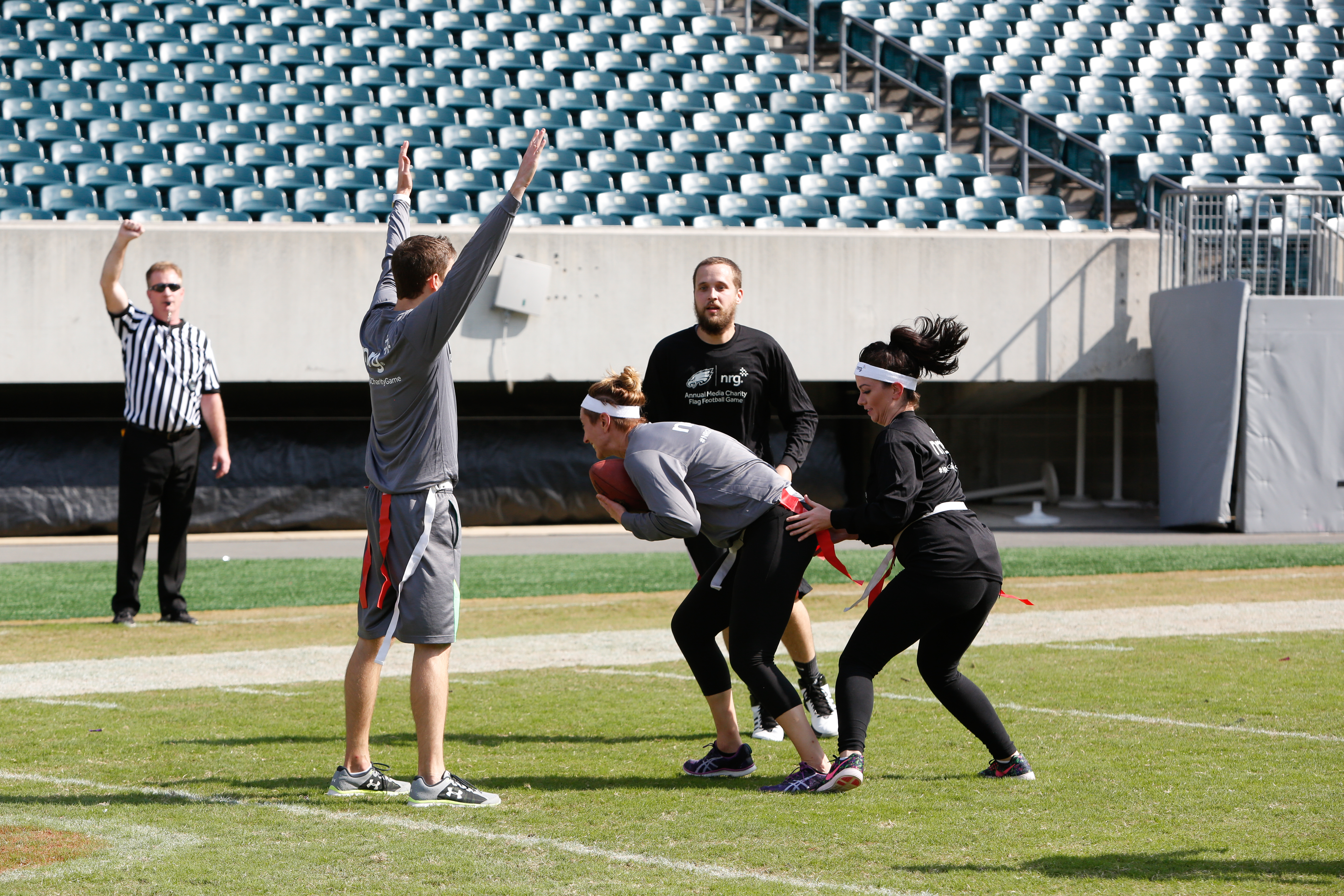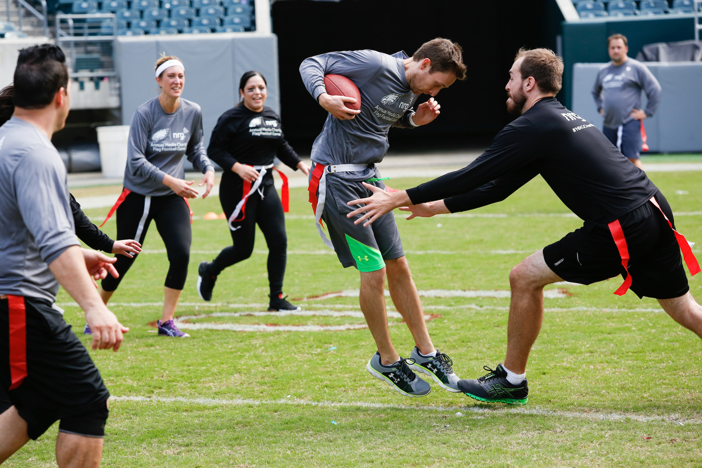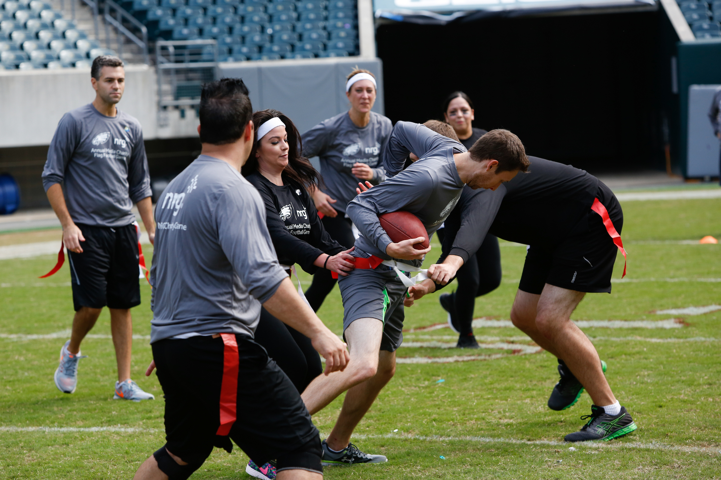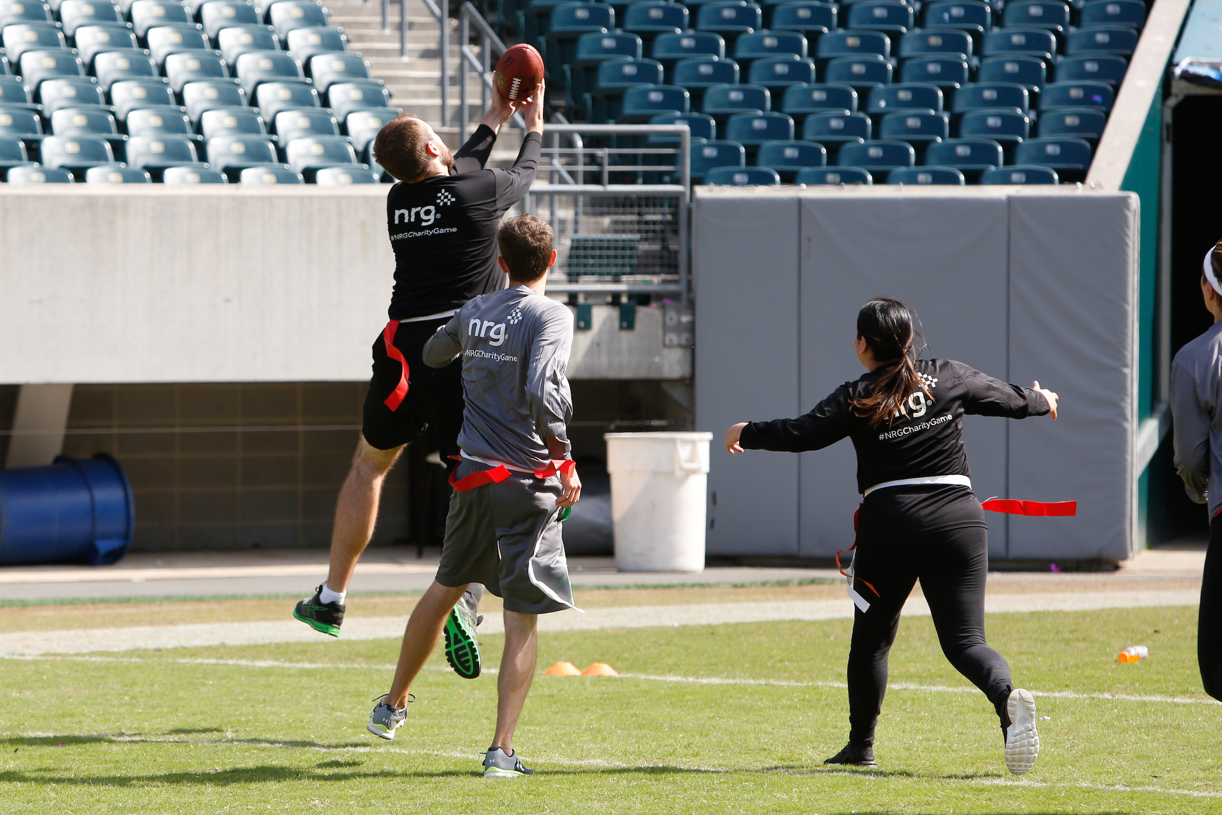 The good folks over at NRG Energy, longtime friends of the site, Eagles sponsors and partners of Connor Barwin, hosted a media flag football game at The Linc yesterday. I’ll spare you the 2,500-word recap, but I’d like to call your attention to this photo (as well as some others), featuring, from left-to-right, Phillies beat writer Ryan Lawrence, me, KYW anchor Dan Wing, and Julie Hancher of Green Philly. It would appear that three humans are battling with one ape to obtain an object of some intrinsic value before it unceremoniously crashes into the (shockingly hard and slightly unkempt) turf. What’s actually happening is stud defender breaks up pass intended for Wing (whom I believe won MVP last year) while he’s illegally blocked by Lawrence as Hancher attempts to save face for three pathetic males by actually catching the goddamn thing. Or, if you prefer, a pasty blogger commits pass interference in a flag football game: