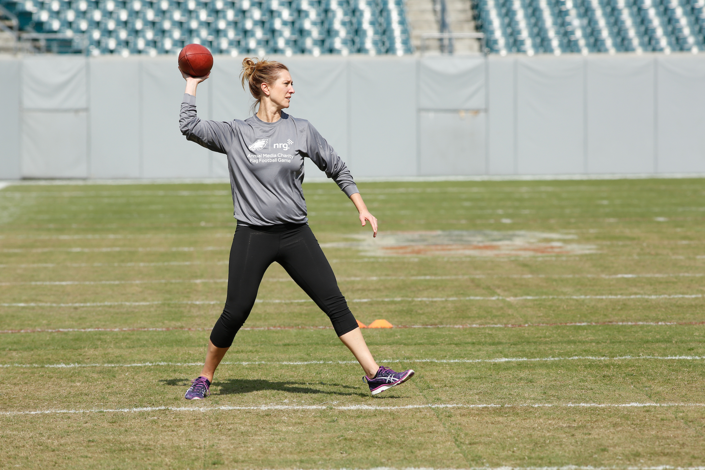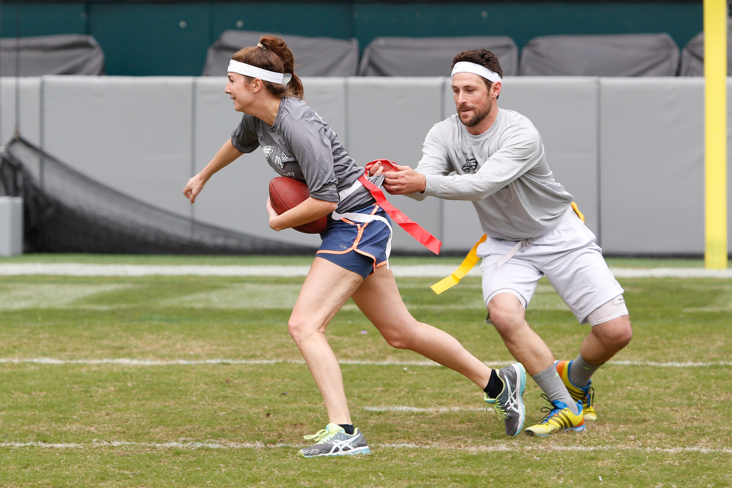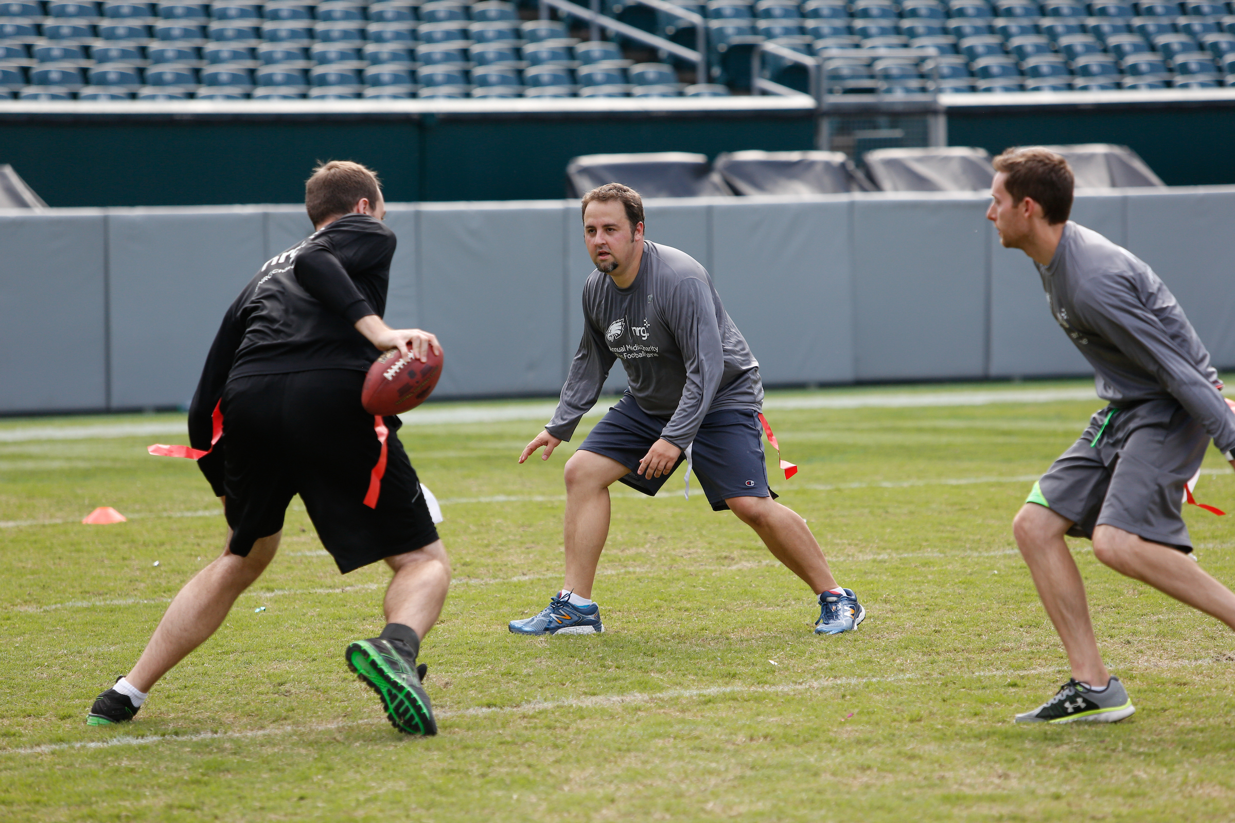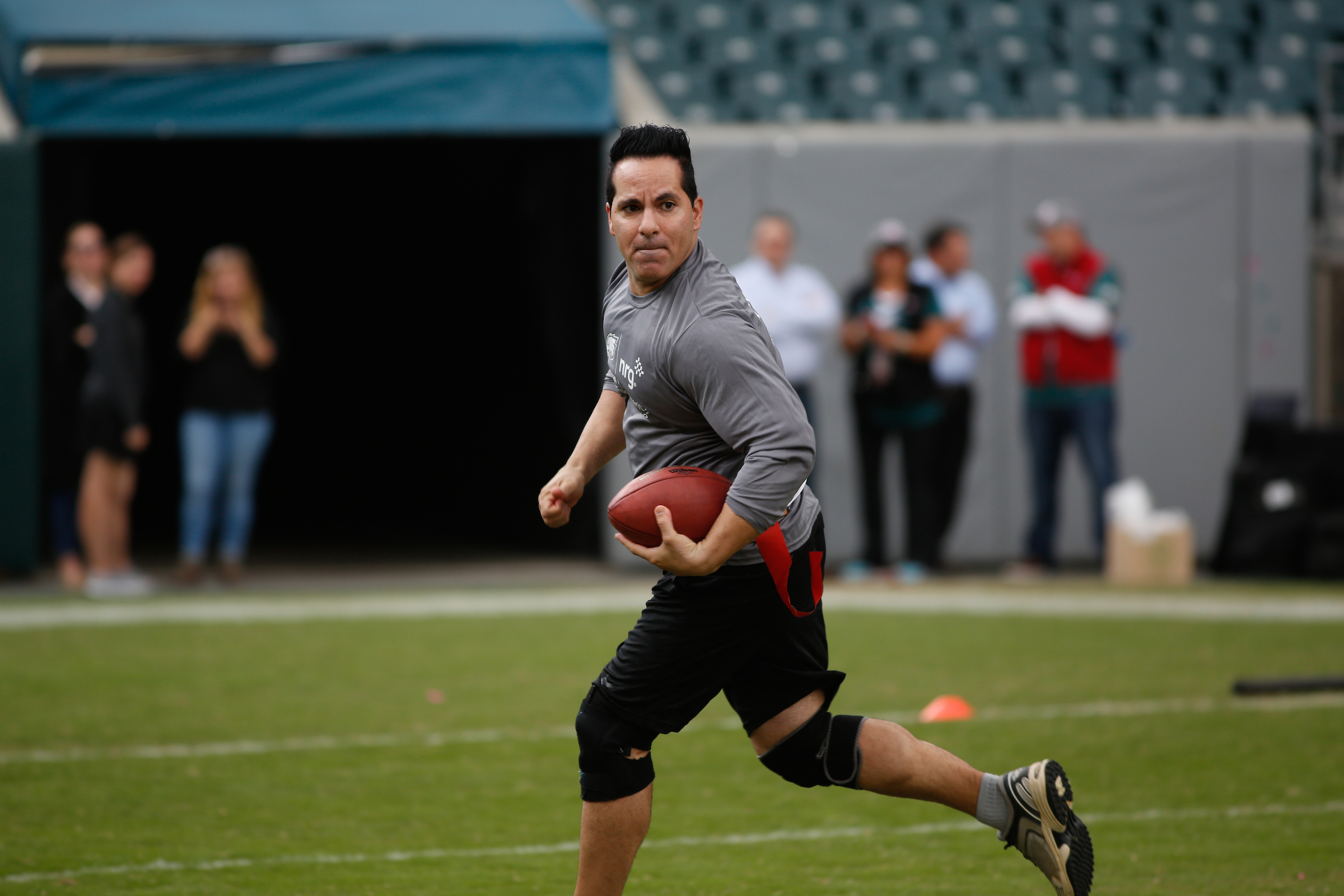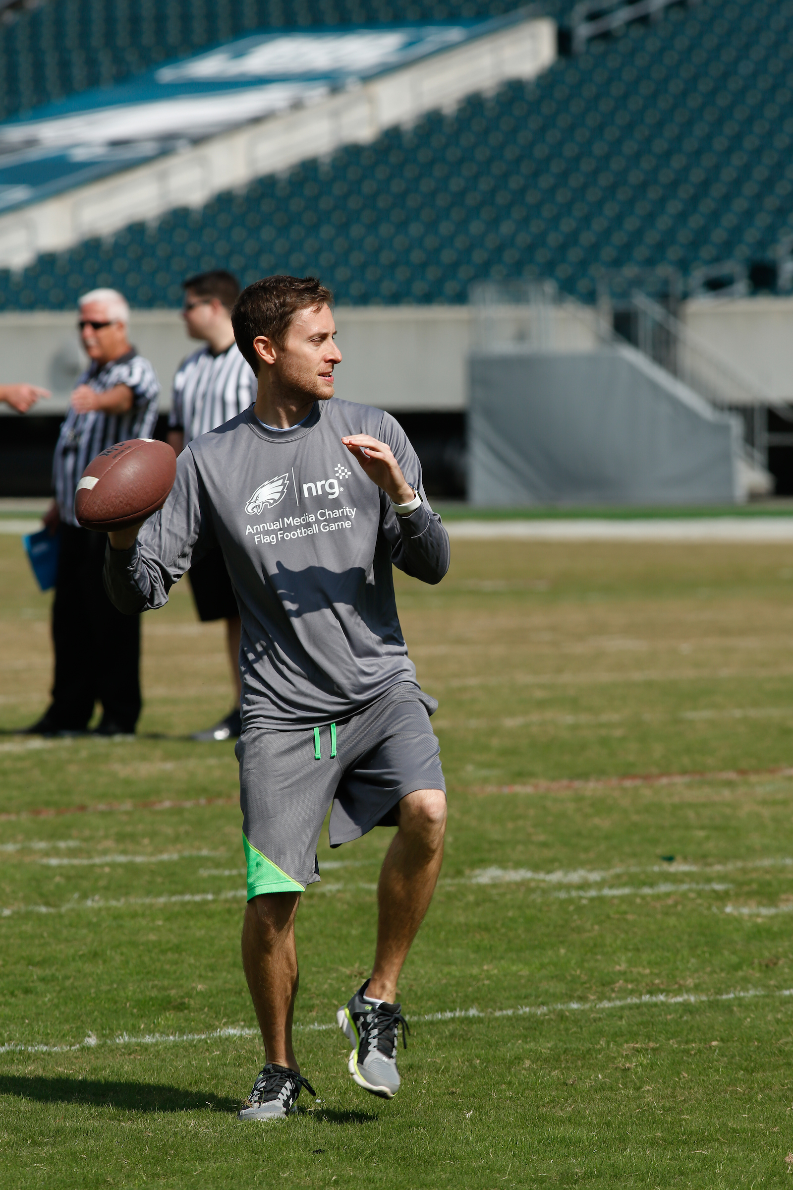 The good folks over at NRG Energy, longtime friends of the site, Eagles sponsors and partners of Connor Barwin, hosted a media flag football game at The Linc yesterday. I’ll spare you the 2,500-word recap, but I’d like to call your attention to this photo (as well as some others), featuring, from left-to-right, Phillies beat writer Ryan Lawrence, me, KYW anchor Dan Wing, and Julie Hancher of Green Philly. It would appear that three humans are battling with one ape to obtain an object of some intrinsic value before it unceremoniously crashes into the (shockingly hard and slightly unkempt) turf. What’s actually happening is stud defender breaks up pass intended for Wing (whom I believe won MVP last year) while he’s illegally blocked by Lawrence as Hancher attempts to save face for three pathetic males by actually catching the goddamn thing. Or, if you prefer, a pasty blogger commits pass interference in a flag football game: