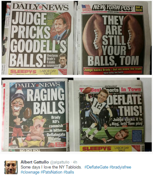 There’s really only one pun, which is disappointing: New York’s papers of record, the Post and Daily News, both took on Deflategate on their front and back covers today, showing some measured restraint.