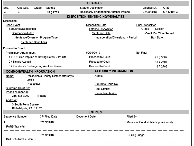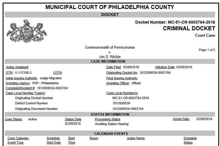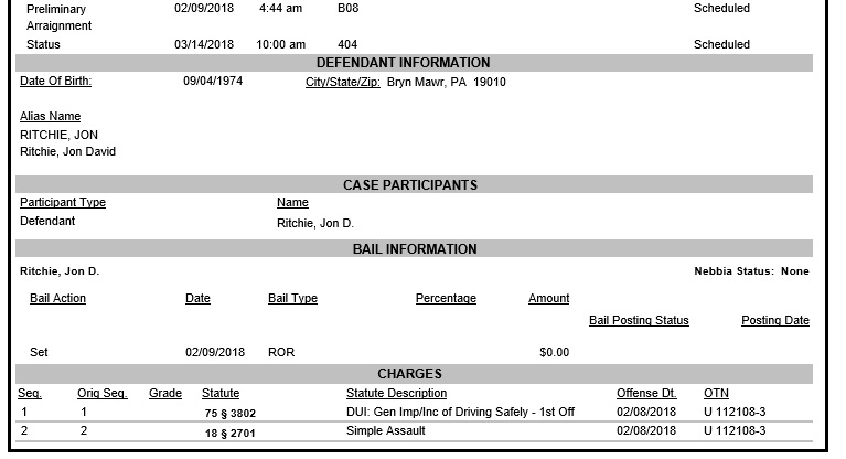 According to the court docket, Ritchie was arrested by Pennsylvania State Police then released on his own recognizance (ROR), which is when there’s no bail payment and you agree to return to court when ordered. In this case, that’s March 14th, a status hearing at Philadelphia Municipal Court.