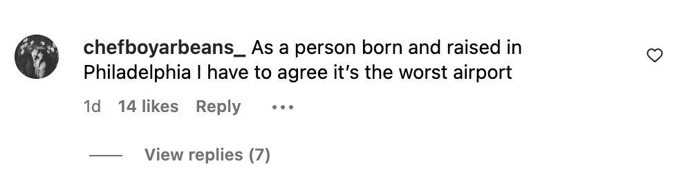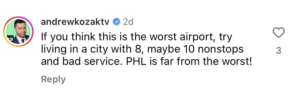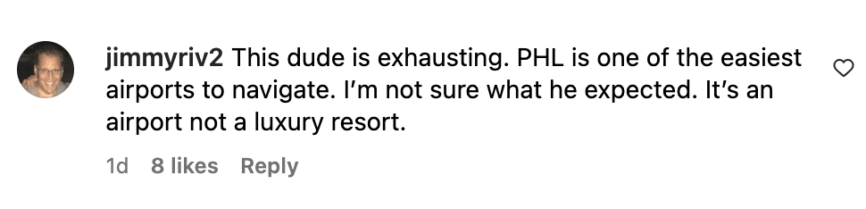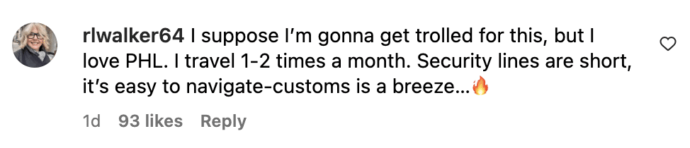 I like PHL for what it is.  I can get to bag check, through security, and to my gate in 30 minutes. This guy didn’t even get to experience the top-5 shortest wait time in the country.  Now, I am a self-proclaimed passenger princess and TSA PreCheck is the best investment I’ve ever made, for what it’s worth. But most airports you need to get there two hours before, not PHL on regular days. And don’t get me wrong, AMEX Lounges and American lounges are a great perk. But overcrowding isn’t just a Philly problem. Give me Dunkin’ and sitting at the gate or hanging at the Jack Duggan’s while waiting for my flight. They’re also spending to improve it. I’m hearing the new Sabrina’s in Terminal C is pretty good.