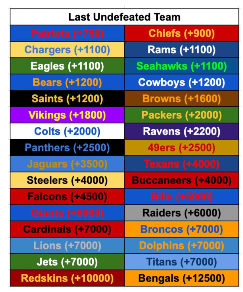 DraftKings is also offering a market for the NFL’s last defeated team. The Patriots have the shortest odds at +750. The Eagles are tied for the third-best odds with the Chargers, Rams, and Seahawks at +1100. The Giants check in at +6000 and the Jets have the third-longest odds at +7000. Here are the full market odds: