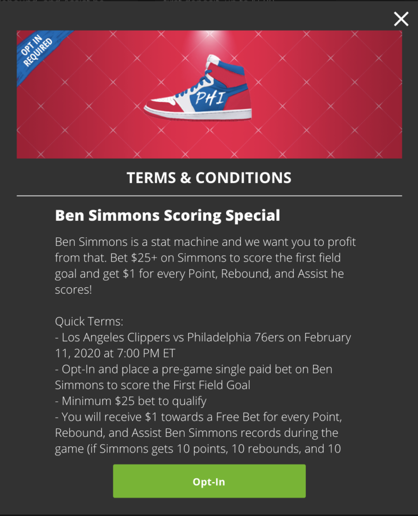 This one is always worth a look. Ben Simmons is +650 to score the first field goal of the game, which are the same odds given to teammate Tobias Harris. Sure, the dynamic duo of Kawhi Leonard and Paul George are slightly better bets at +600 and DraftKings seems to believe in Joel Embiid’s determination to get the first bucket at +420, but that’s not the point. If Simmons makes the first basket of the game, you’ll get $1 for every point, rebound, and assist he scores in the game. Just navigate to the promotions page and opt-in to the bonus. Minimum $25 bet required.