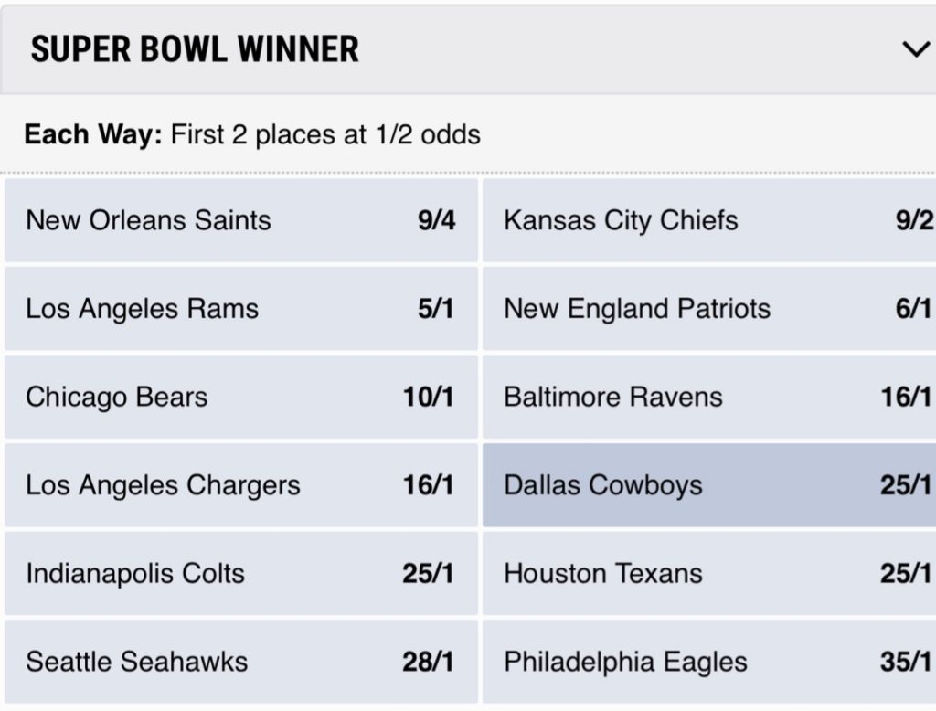 Holy Schnikes! FanDuel has the Eagles (+3400) opening at 34 to 1 to win the big game. It’s interesting to note that while the first seven teams are placed in identical positions, FanDuel swapped Dallas and Houston, as well as Seattle and Indianapolis. The Eagles, in this case, remain in twelfth place out of twelve. Perhaps you’re feeling a bit more confidence to throw a little money at this bet? Does the prospect of winning $680 plus your $20 wager worth it? Again, you decide.