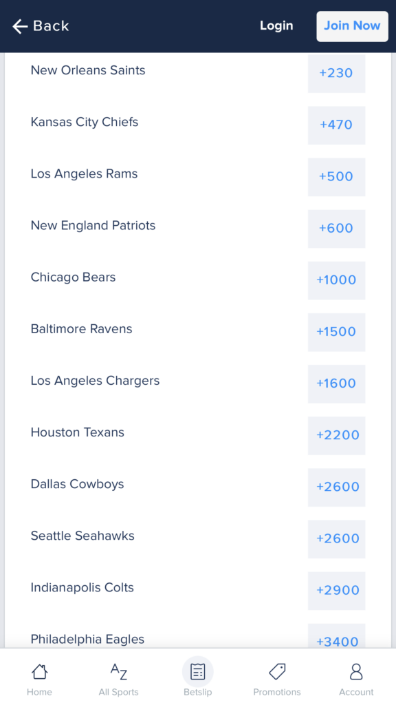 Woof. The Eagles (+2500) and Seahawks (+2800) are 25 to 1 and 28 to 1 respectively to win the Super Bowl. This is the only sportsbook of the three that doesn’t have the Eagles in dead-last, but it’s not by all that much. Could it be worth a small flier for $10 with a chance to win $250 plus that initial $10 investment? You decide.
