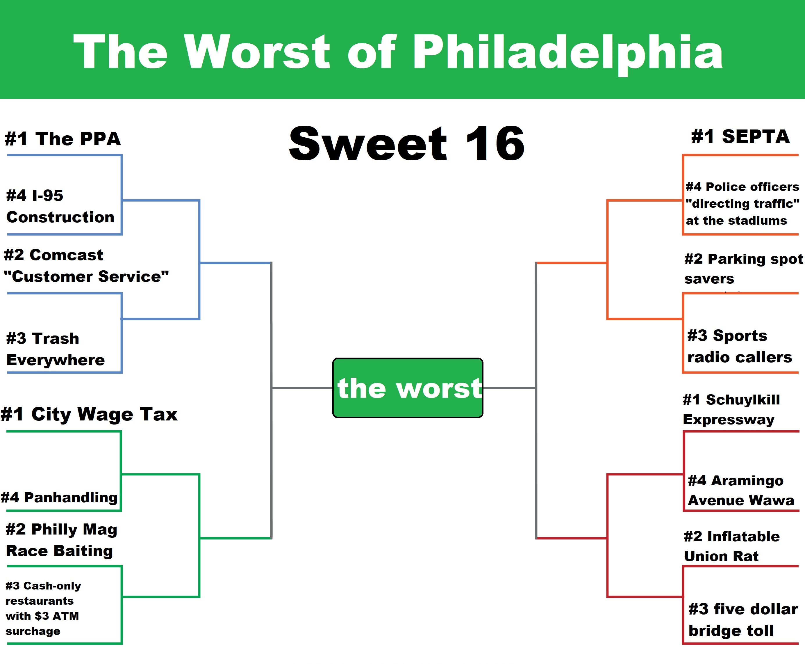 Inspired by the concept, I decided to do a Philly-only spinoff, but out of respect to the originator, I didn’t include any of the local items that made it into Brian’s bracket. And since I didn’t get around to this last week, I decided to just do a Sweet 16 of Philadelphia’s most atrocious things, though we could certainly think of 64 entries, or even 68.