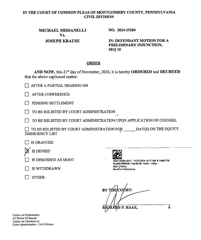 This motion for a preliminary injunction was filed by JAKIB a few days before Halloween. It sought to prevent Missanelli from “1) engaging his audience and utilizing his daily radio show, The Mike Missanelli Show, to discuss this lawsuit and disparage the defendant, 2) contacting current and previous independent contractors of JAKIB Media via text message or by phone with disparaging remarks about the Defendant and his company.. 3) contacting the Defendant, Joe Krause via text message or by phone with intimidating messages and statements, and 4) contacting current and previous sponsors of JAKIB Media by text message or by phone until this Court has an opportunity to issue a final judgement on the merits.”