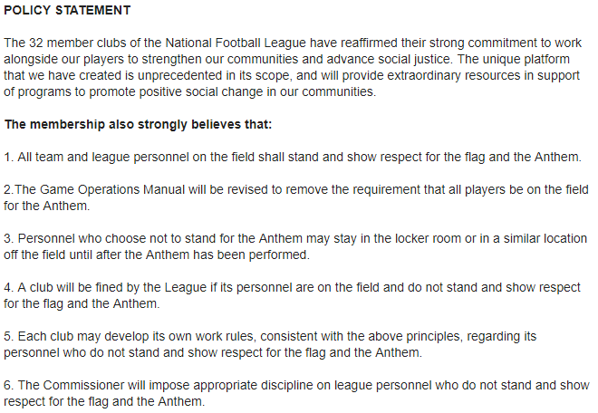 There’s some vague language in the policy statement, RE: the “show respect” line. Malcolm Jenkins, for instance, stands for the anthem but raises his fist. Others lock arms. We’ll see how players and coaches respond to the news in the coming days/weeks/months.