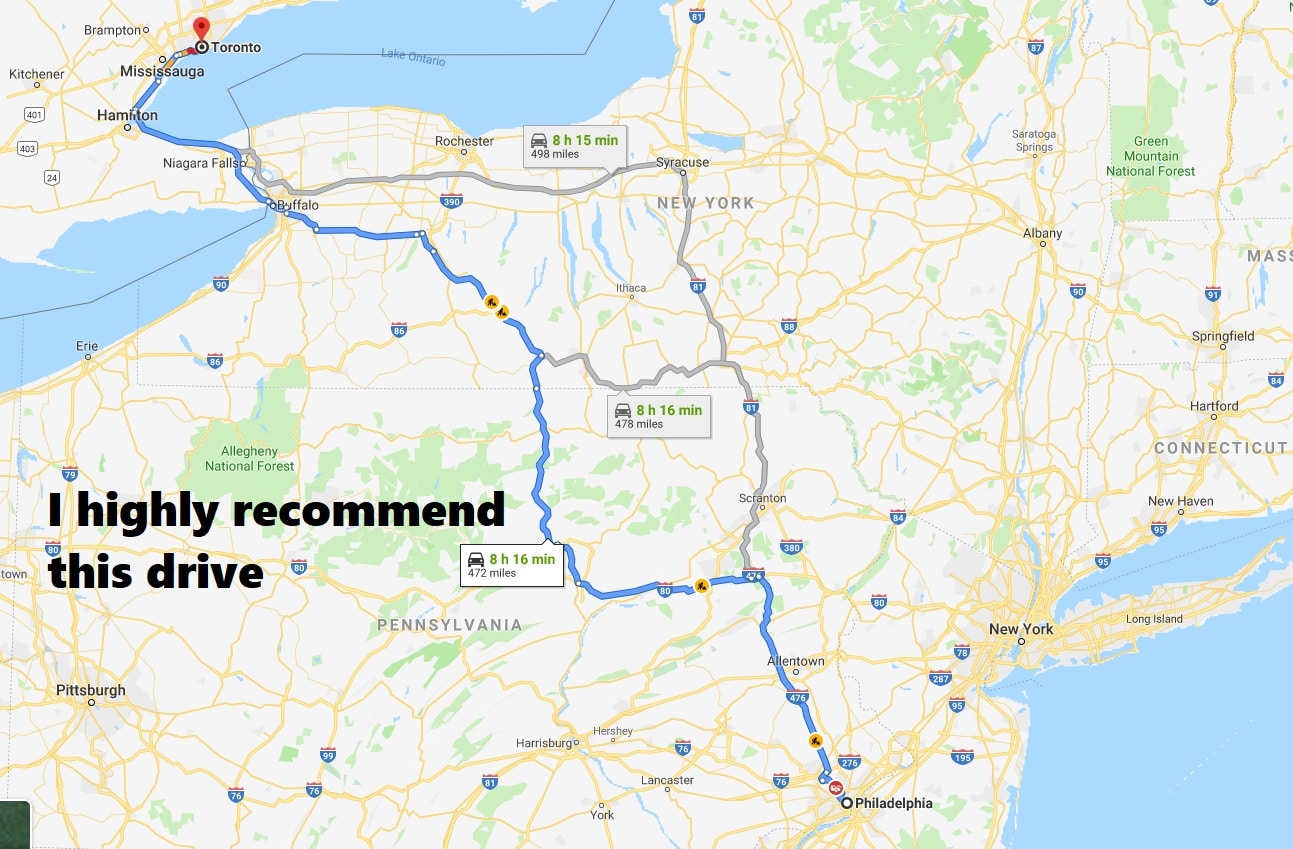Montreal and Toronto are both about eight hours from Philly. The drives really are not bad at all. Actually Toronto is a very nice trek, because you’re going up the Northeast Extension, then taking 80 through Wiliamsport and up into New York. It’s a really scenic ride. Montreal is a straight shot up 87 through equally pretty upstate New York:
