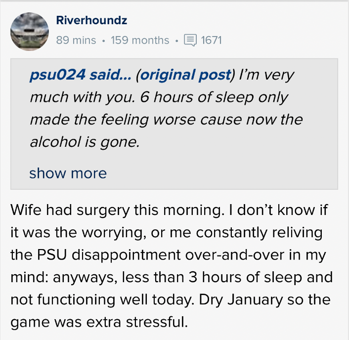 This Penn State fan is taking the loss extra hard. He’s sad of course, but he can’t decide if it’s from his wife having surgery or a bunch of 20-year-olds losing a football game. It’s equal parts amazing and equal parts sad the stranglehold sports has on our brains: