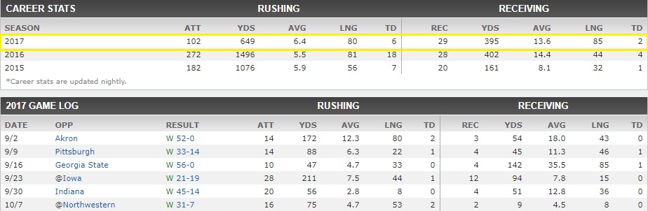 Barkley has incredible hands and has put up some receiver-like numbers as a running back. His route-running is excellent. He went for 94 yards in the Iowa win and ripped off gains of 46 and 36 against Pitt and Indiana. He also returns kicks and took one 98 yards to the house against Indiana. Compared with Love, he’s obviously the more versatile player when it comes to all-purpose yardage, which I think carries more value overall, especially when viewing him as an NFL prospect. For that reason alone, his overall touches eclipse Love’s, even with one fewer game played.