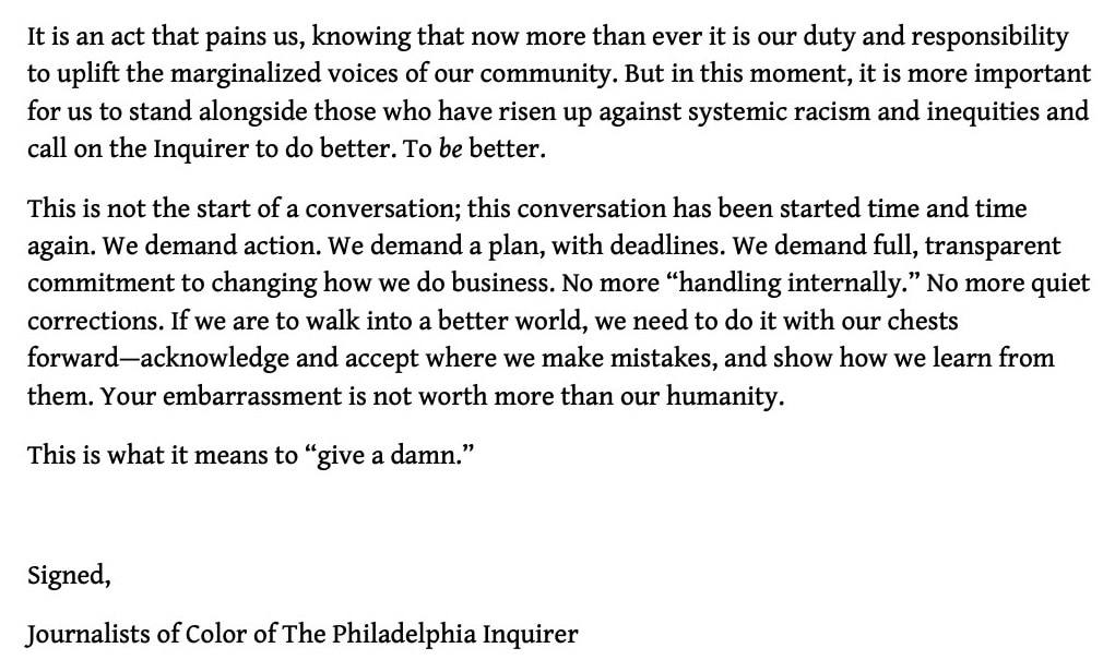 The paper changed the wording and apologized, but apparently that was not enough to assuage concerns, because Inquirer employees issued an open letter to management and are calling out of work today.