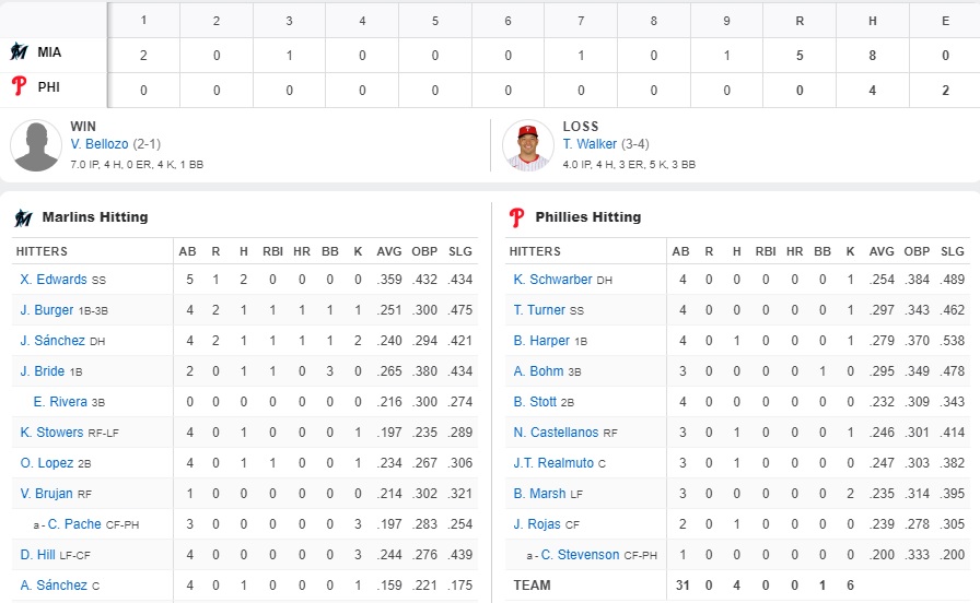 So much for the end of the road trip, the day off, and getting to play in front of the home fans again. They mustered a grand total of four hits against Valente Bellozo, who made his Major League debut this summer and is so new that he does not yet have a profile picture. They made him look like the second coming of Sandy Koufax. Kyle Schwarber? 0-4. Trea Turner? 0-4. Bryson Stott? Another 0-4 and calls for him to be sent down to the minors or platooned alongside Edmundo Sosa. The Phils couldn’t hit, couldn’t draw a walk, and found themselves in a 2-0 hole early with Taijuan Walker on the mound and that was all she wrote.