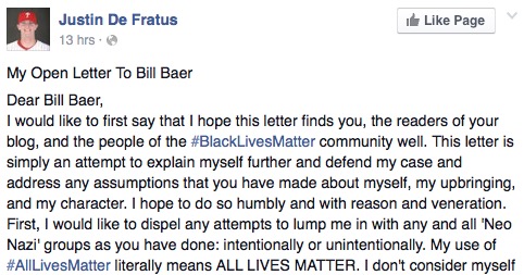 Baer, in an open letter to Justin De Fratus, decided to compare the Phillies pitcher to a neo-Natzi over his thoughts on the #BlackLivesMatter hashtag (De Fratus thought it better to use #AllLivesMatter). Behold a sampling of this dreck: