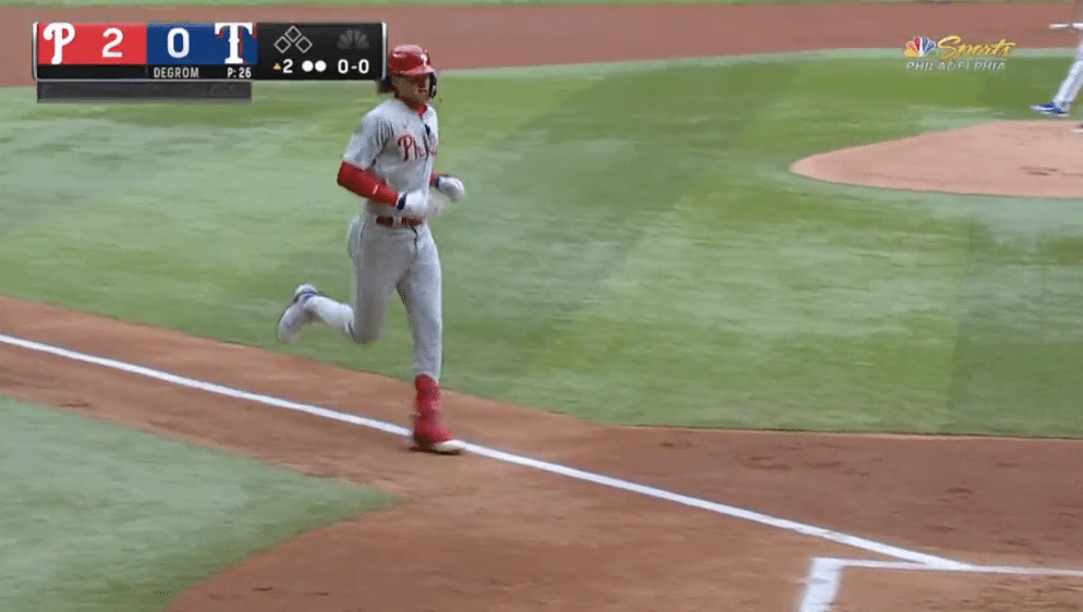 deGrom is getting SHELLED right now! Back-to-back triples by Brandon Marsh and Trea Turner. A wild pitch just scored Turner. When’s the last time the Phillies put up four runs against deGrom? Five extra base hits already! Nick Castellanos hit an oppo double! There might not be a weak spot in this lineup.