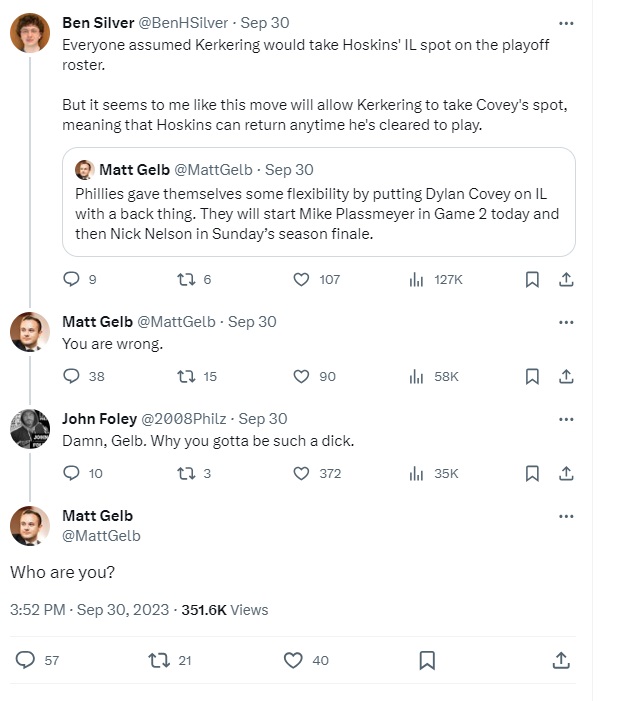 This hire also makes me laugh, because Foley and Matt Gelb teamed up for the best Twitter exchange of the summer. If I’m Phillies PR, I seat them next to each other in the press box, just for shits and giggles:
